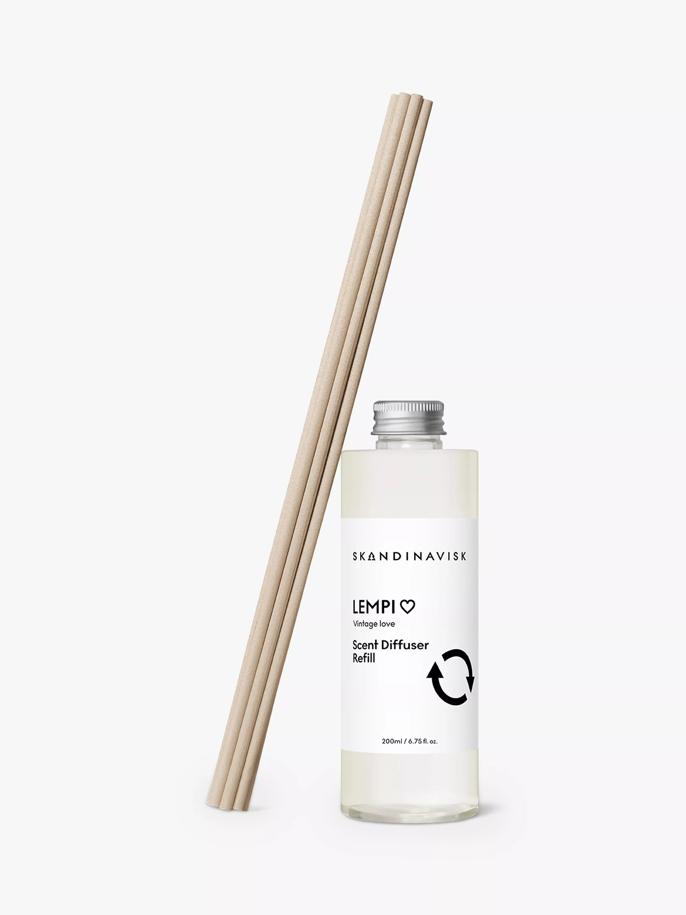 The new Skandinavisk diffuser collection blends Scandinavian fragrance stories with renewably farmed vegetable oils inside a painted glass vase that is designed to be refilled for up to 3 additional months of gentle room fragrance. Alcohol-Free. Non-hazardous. Vegan. The 200ml refill is contained in recycled plastic (rPET). Just pour the refill carefully into the Skandinavisk glass, replace the reeds, then rinse and recycle the empty refill bottle. The FSC-certified packaging card is printed using natural colour dyes and can also be recycled.