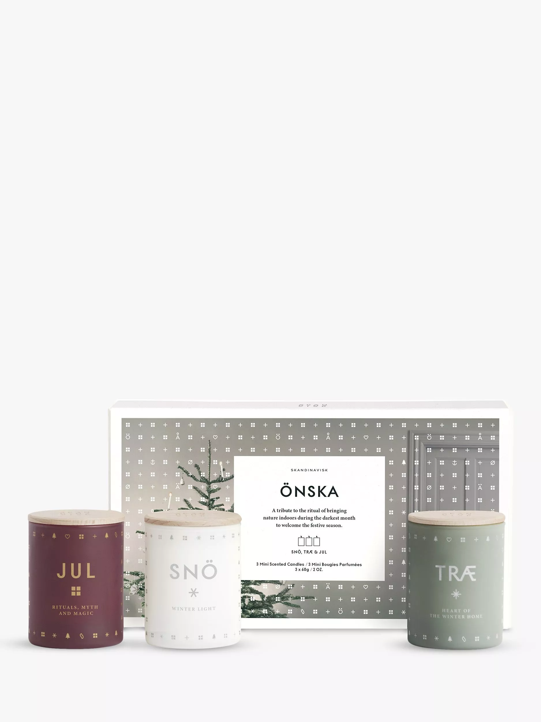 A set of mini glass votives in the Onska scent - a tribute to the ritual of bringing nature indoors during the darkest month to welcome the festive season.