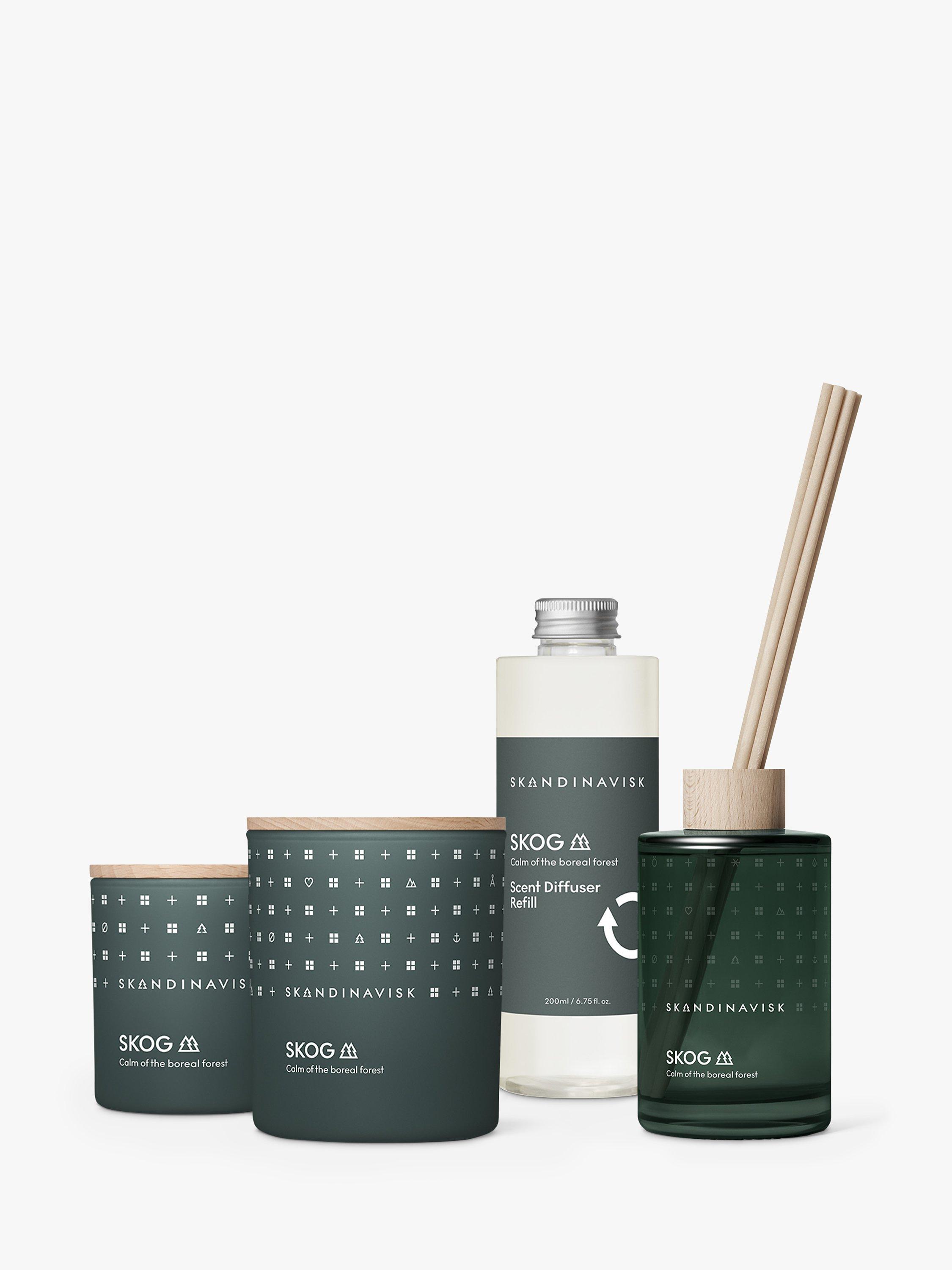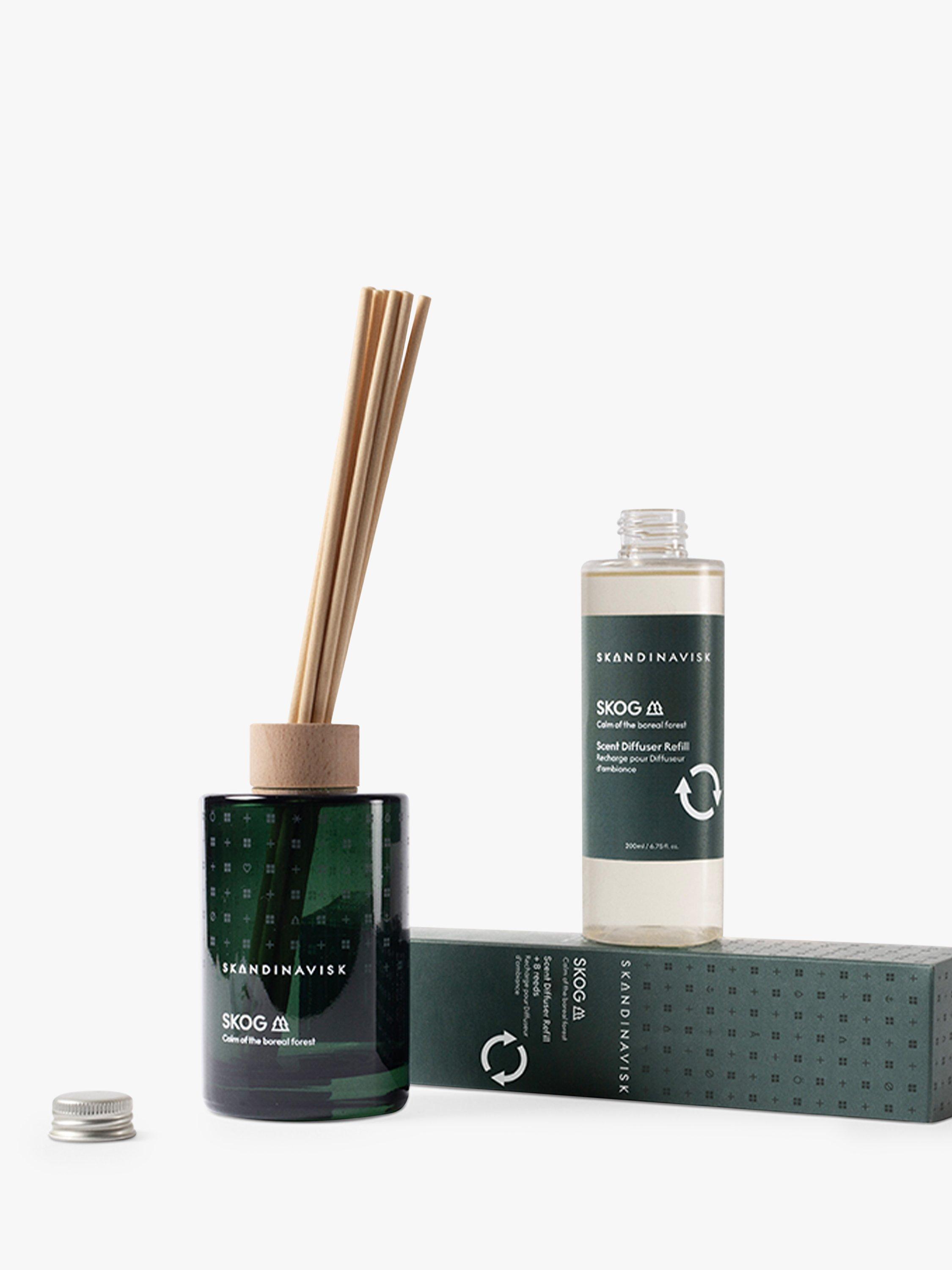 The new Skandinavisk diffuser collection blends Scandinavian fragrance stories with renewably farmed vegetable oils inside a painted glass vase that is designed to be refilled for up to 3 additional months of gentle room fragrance. Alcohol-Free. Non-hazardous. Vegan. The 200ml refill is contained in recycled plastic (rPET). Just pour the refill carefully into the Skandinavisk glass, replace the reeds, then rinse and recycle the empty refill bottle. The FSC-certified packaging card is printed using natural colour dyes and can also be recycled.