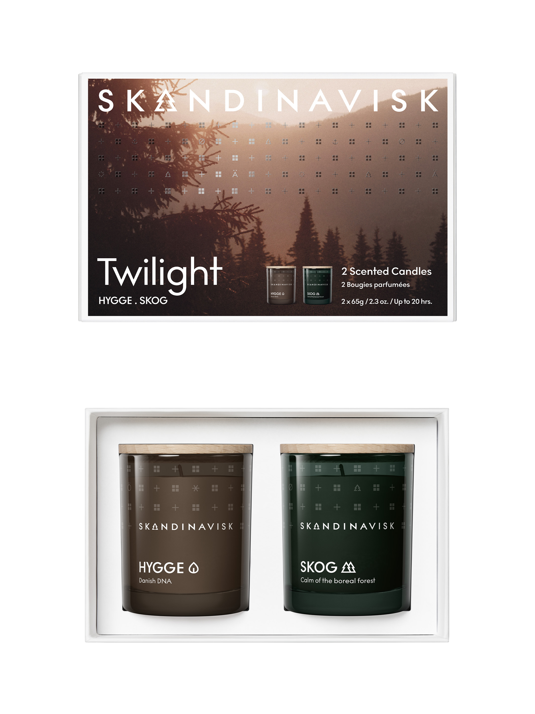 As the sun sets on the boreal forest, a magical glow fills the air. This Twilight scented candle duo giftset brings together signature SKOG scent with the cosy warmth of HYGGE.