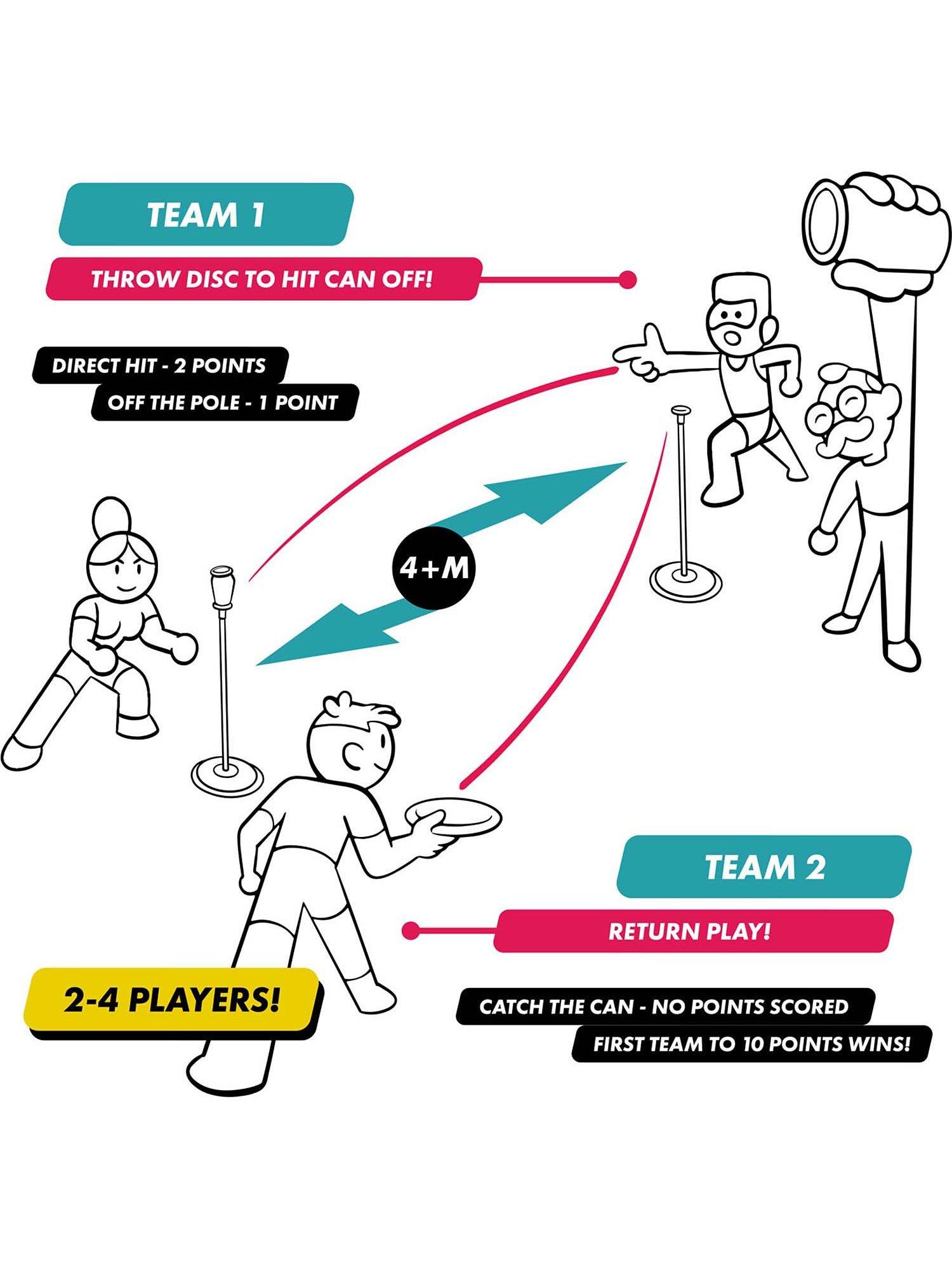 It's simple: two teams, two poles, two cans and one flying disc. You score points by knocking the other team's can off a pole. The first team to ten points wins!