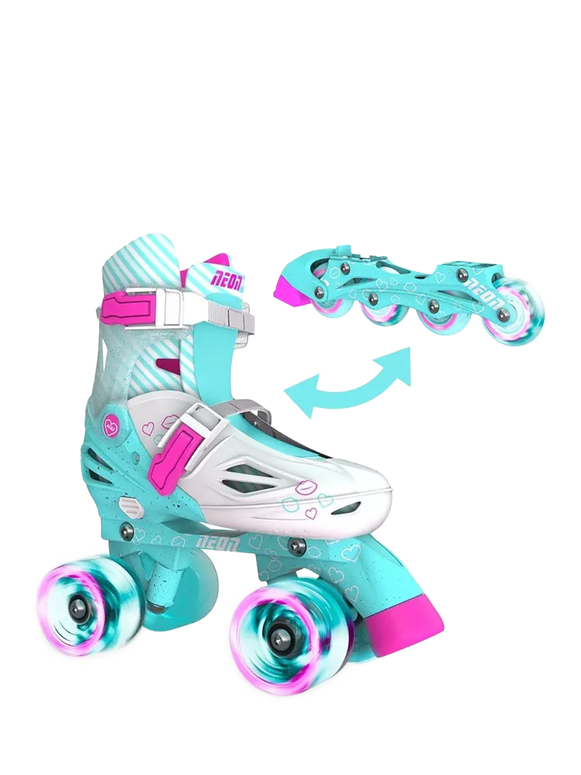The NEON 2N1 Combo Skates brings the best of both worlds. Get ready for double the fun with the NEON Skates! Switch between Inline and Quads seamlessly and watch them light up as you move – no batteries needed! Plus, they're built to last with adjustable sizing for the perfect fit!