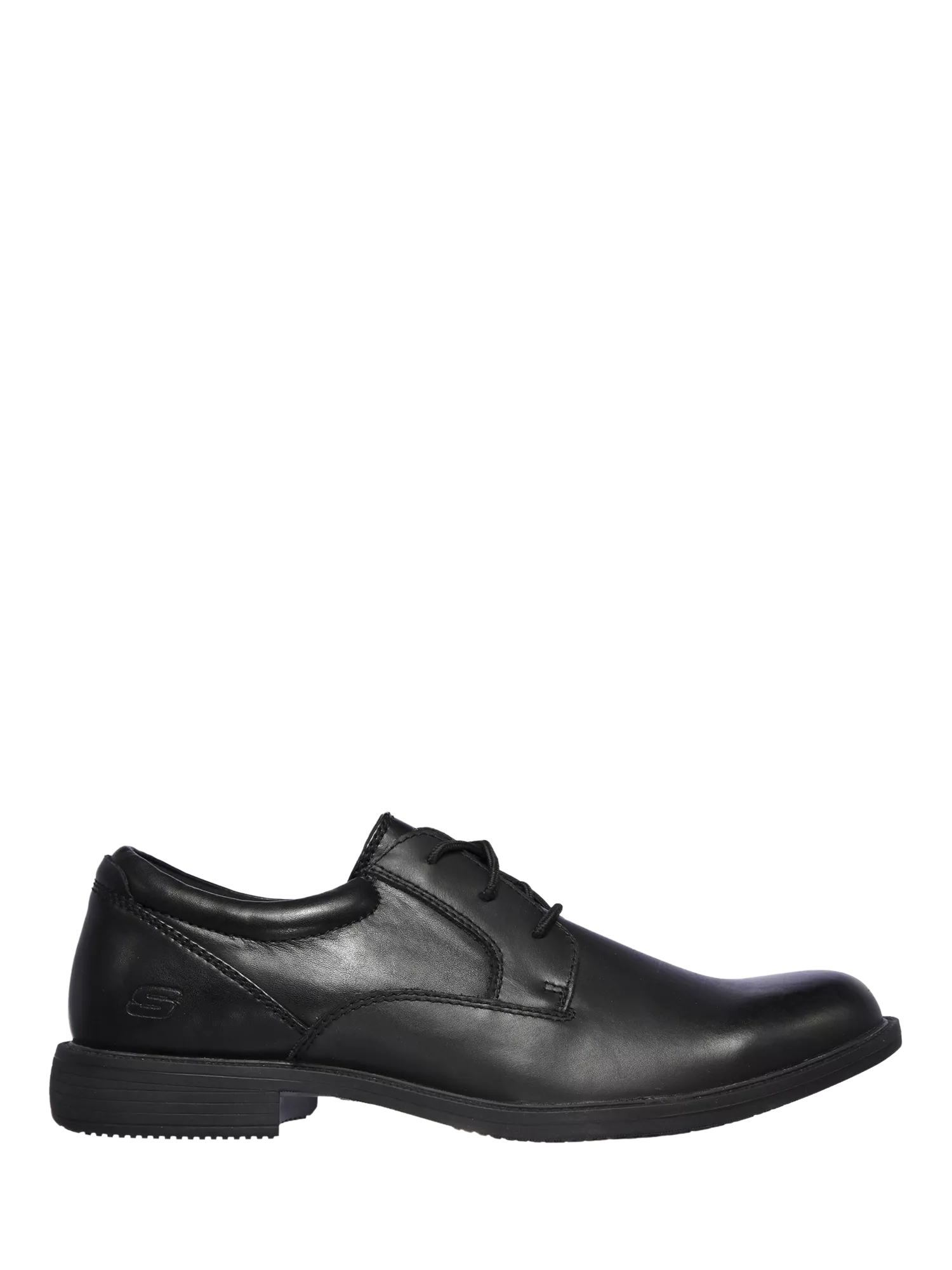 This waterproof design features a smooth premium leather upper in a dress casual lace-up with an Oxford toe, plus a cushioned Skechers Air Cooled Memory Foam insole. Skechers Goga Mat Arch cushion gives added support. Also designed with a shock-absorbing midsole and high traction, flexible rubber outsole.