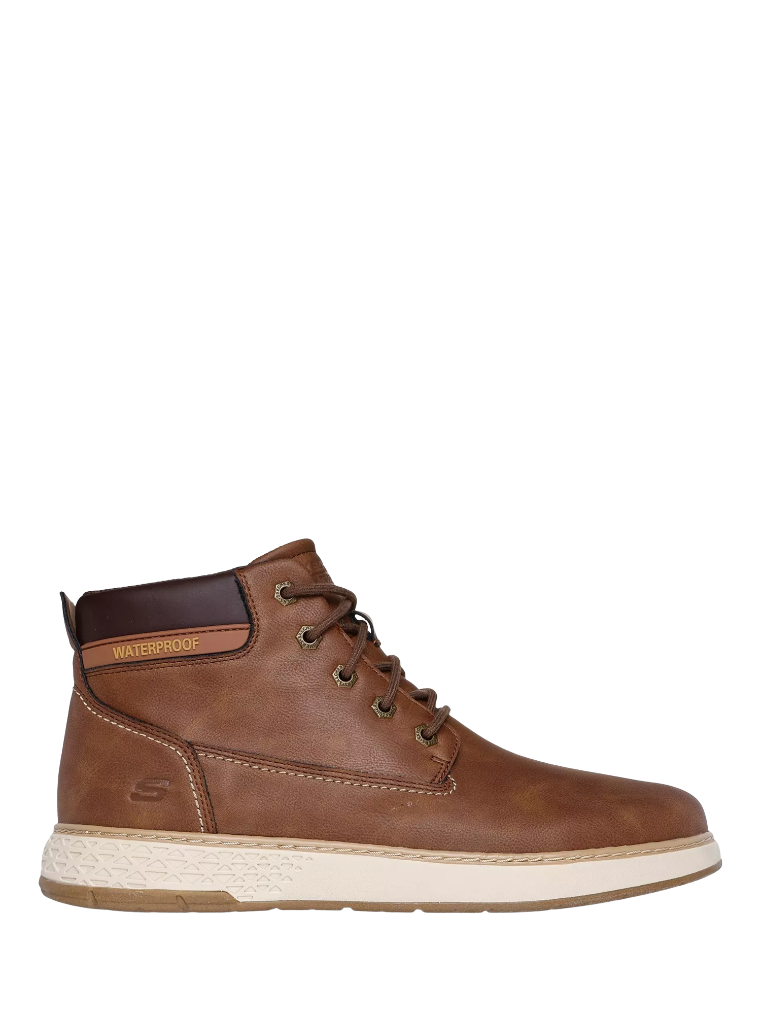 Garlan features a waterproof upper, a charcoal-infused Skechers Air-Cooled Memory Foam insole and Goga Mat Arch cushioning for added support.