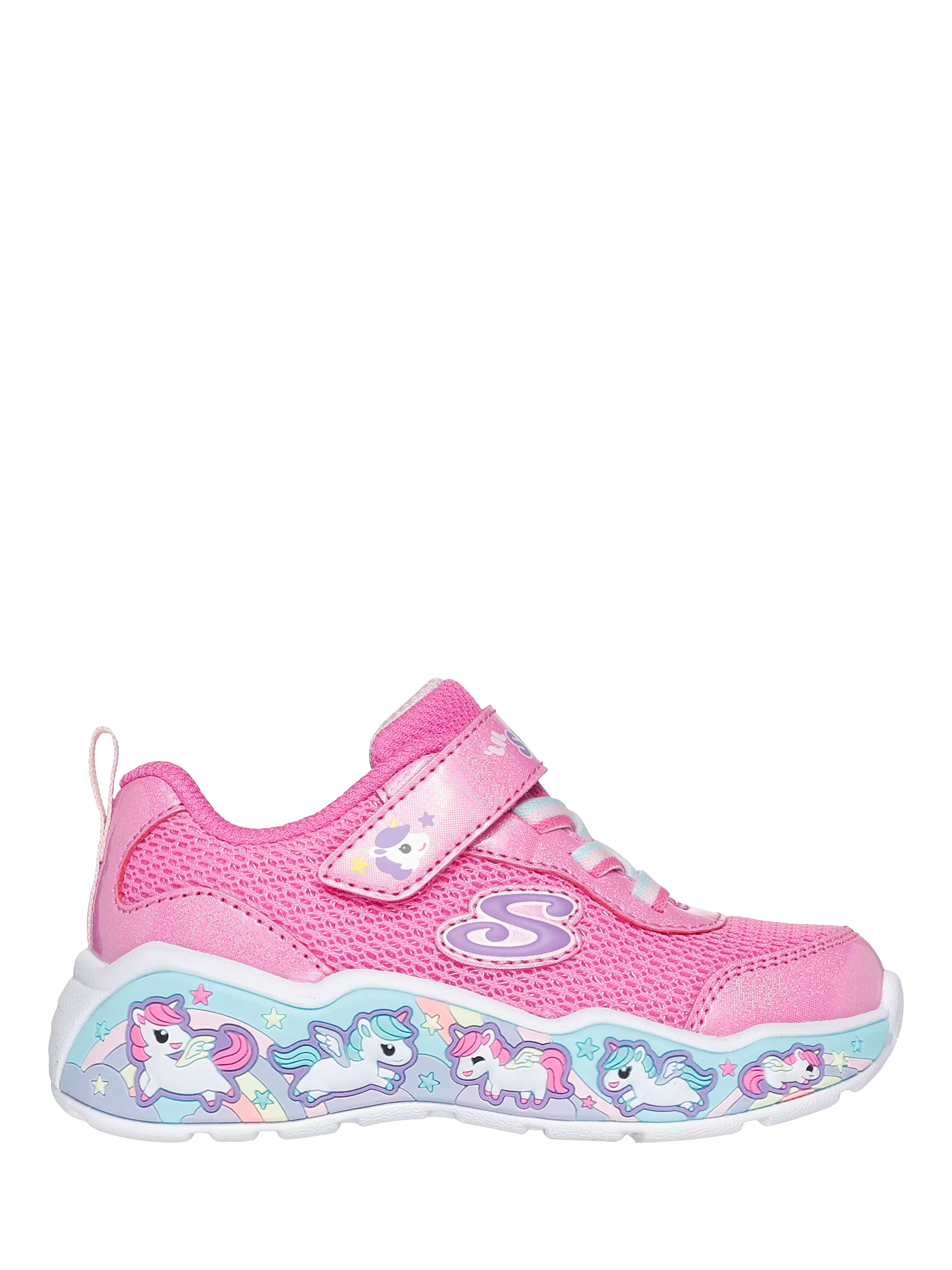 Your little one will be smiling all day long wearing Skechers Play Scene - Fun Squad. This adorable sneaker features a mesh upper with glittery overlays, stretch laces plus Adaptive Closure, and a well-cushioned midsole with playful, themed graphics.