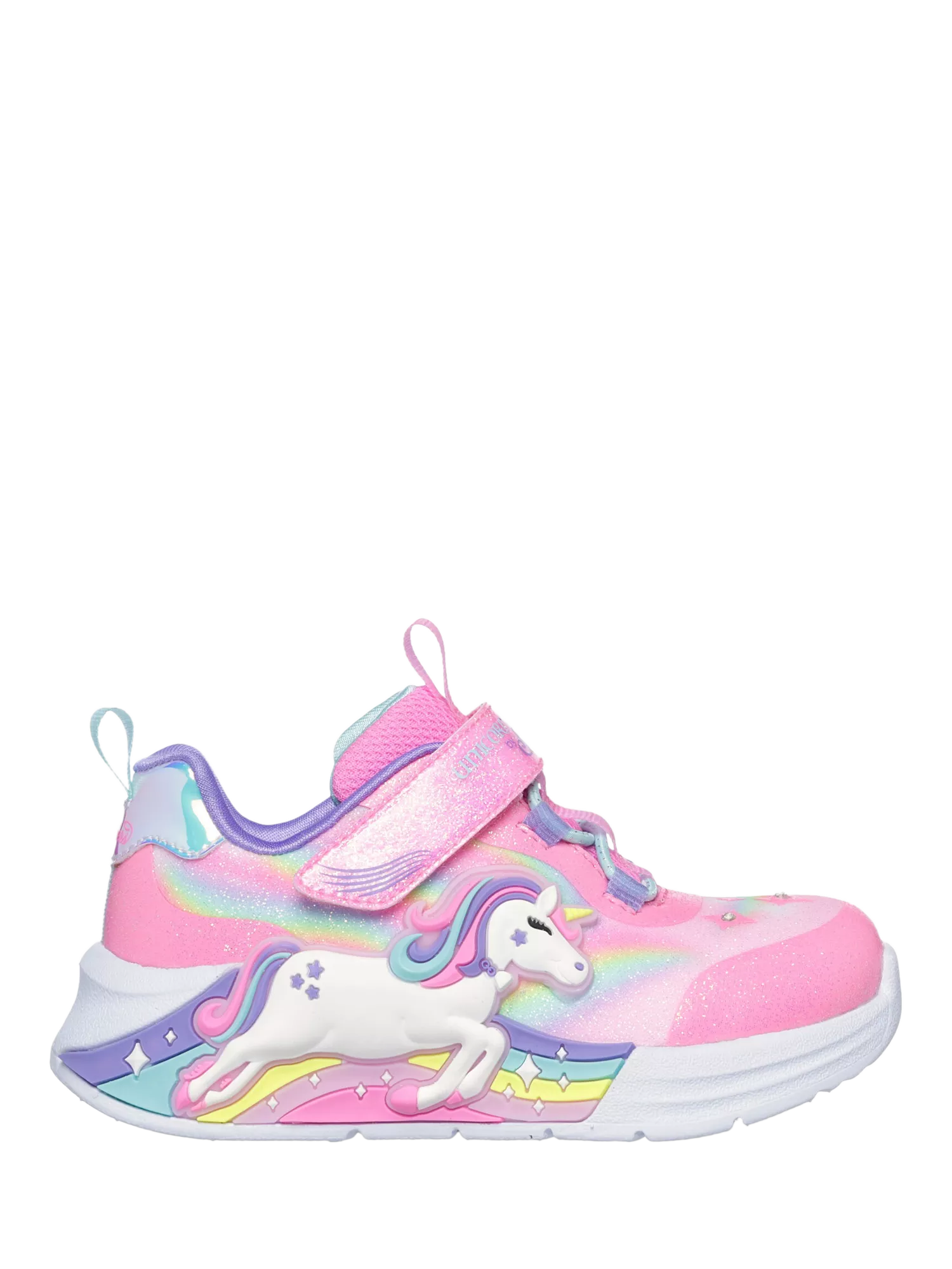 Sparkle and shine in style wearing Skechers S-Lights® Unicorn Chaser. This sporty Magical Collection® lighted design features a synthetic glitter finish upper with unicorn and rainbow side design, stretch laces, adjustable instep strap and a cushioned comfort footbed.