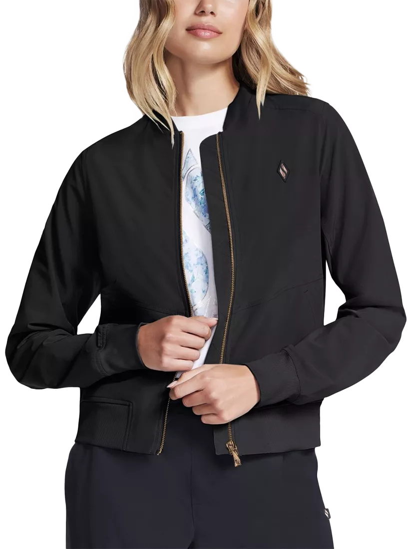 This full-zip jacket is constructed from polyester and spandex, featuring a pair of side pockets and a mock neck.