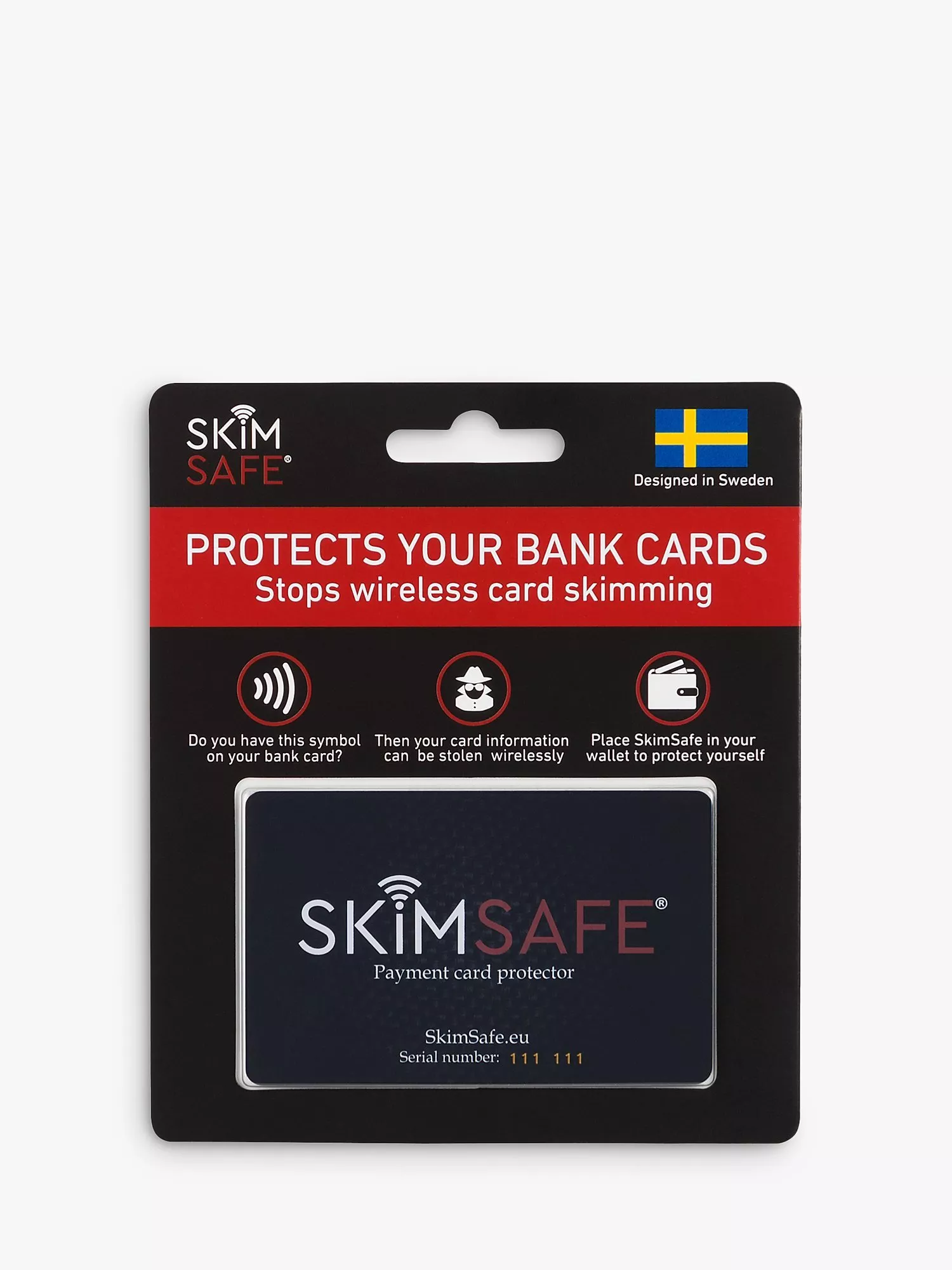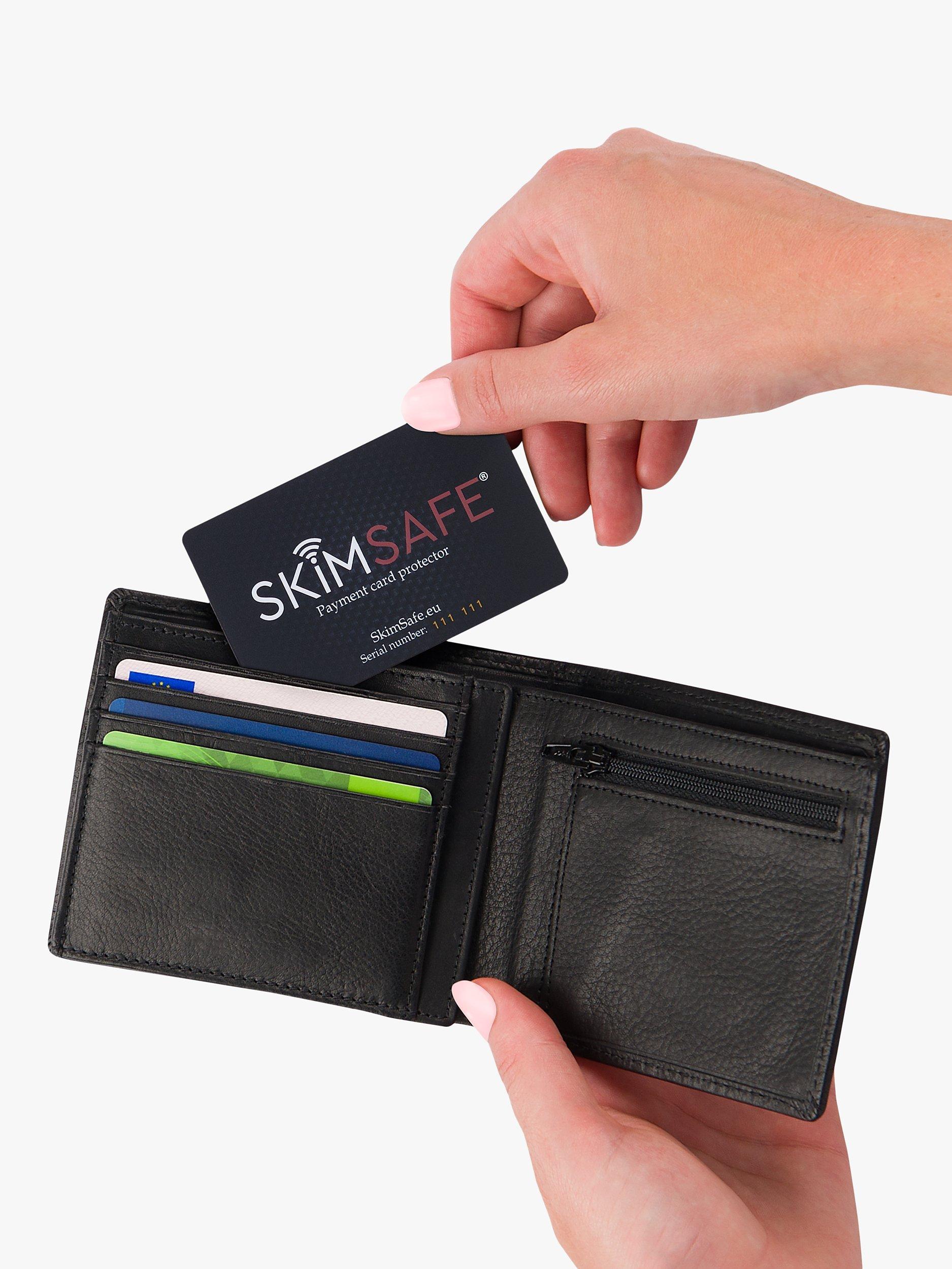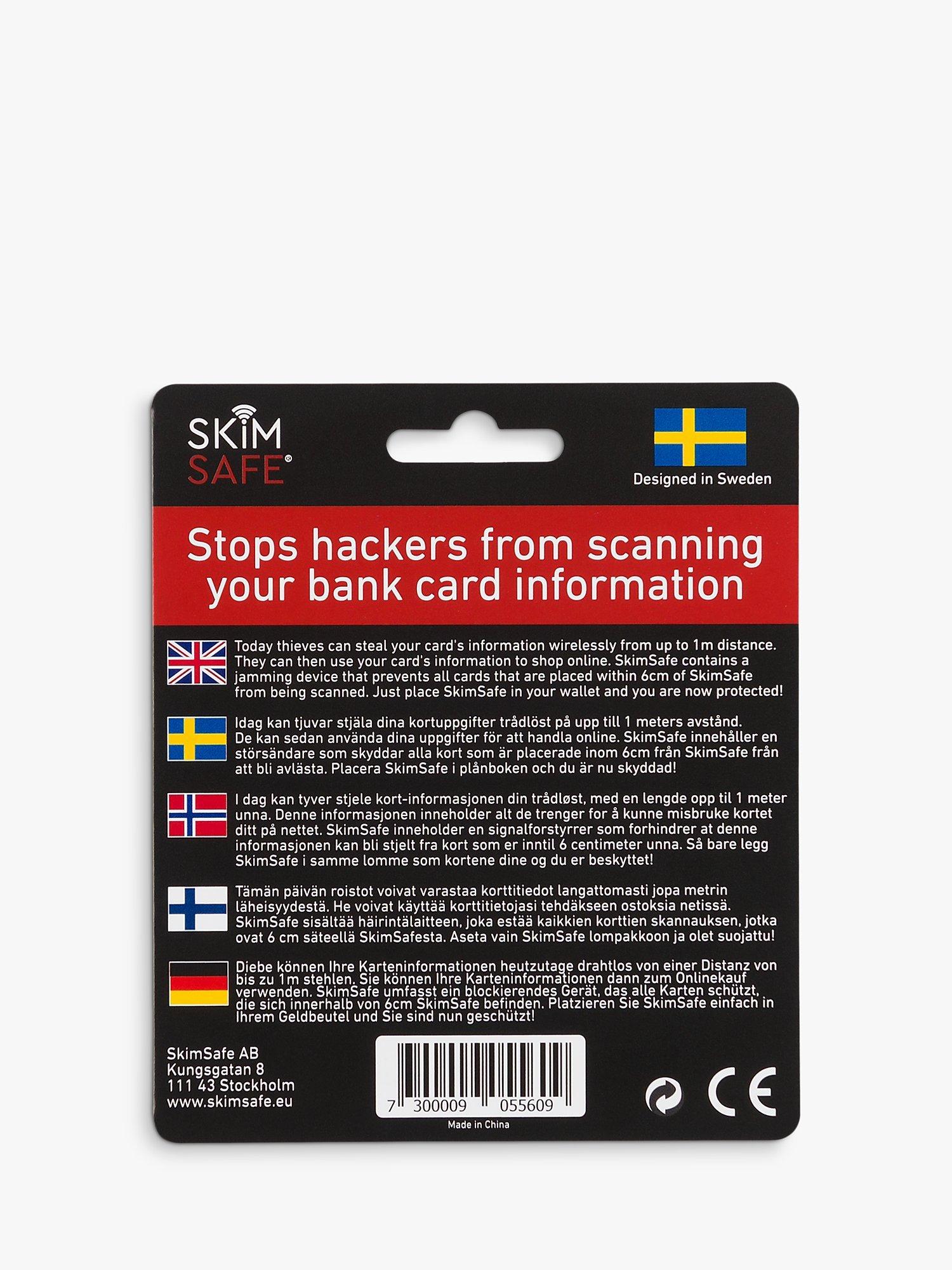 SkimSafe protects against wireless skimming and card fraud. Looking like an ordinary bank card, it contains technology that stops thieves from stealing your card information. It creates an electromagnetic field which makes your cards impossible to scan. Just pop it in your wallet for protection.