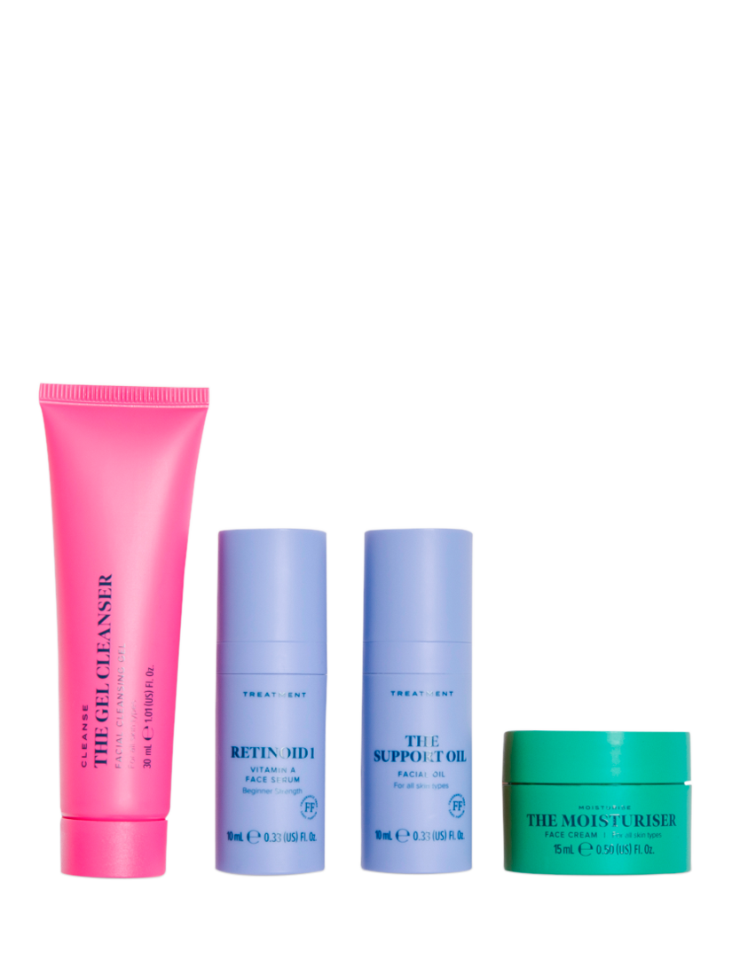 Cleanse away makeup, sun protection and daily debris with The Gel Cleanser and reveal smoother, more even skin with our gently resurfacing, radiance-boosting Retinoid 1. Calm your complexion and reduce the appearance of redness with a few drops of The Support Oil and lock in nourishment with The Moisturiser for a clinically proven increase in skin elasticity and firmness.*