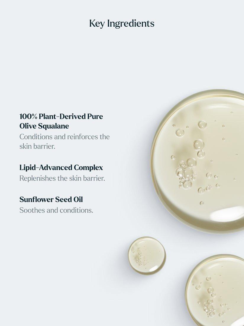 - 100% plant-derived pure olive squalane: Mimics the skin’s natural oils; conditioning the skin, supporting barrier function and maximising water retention