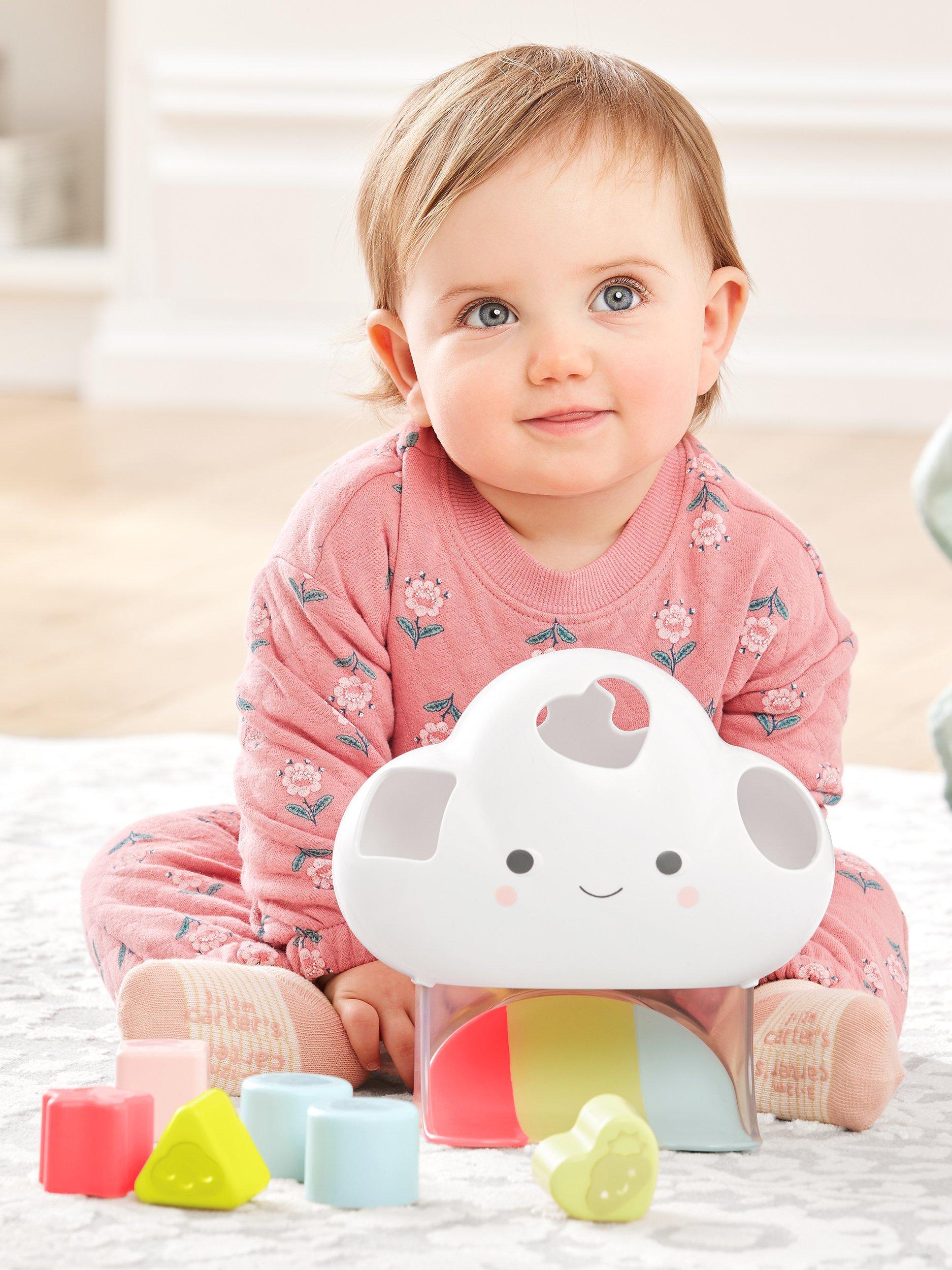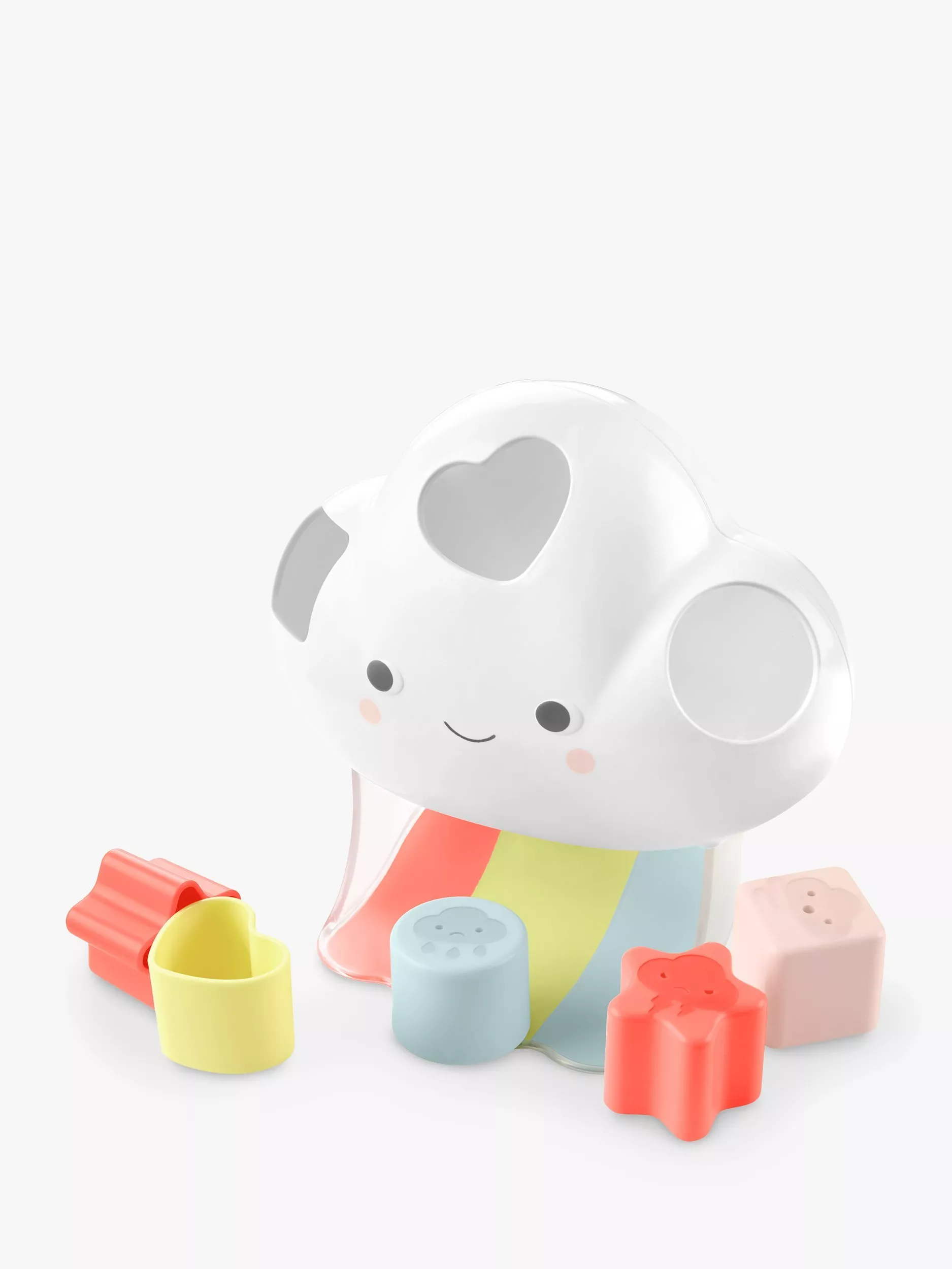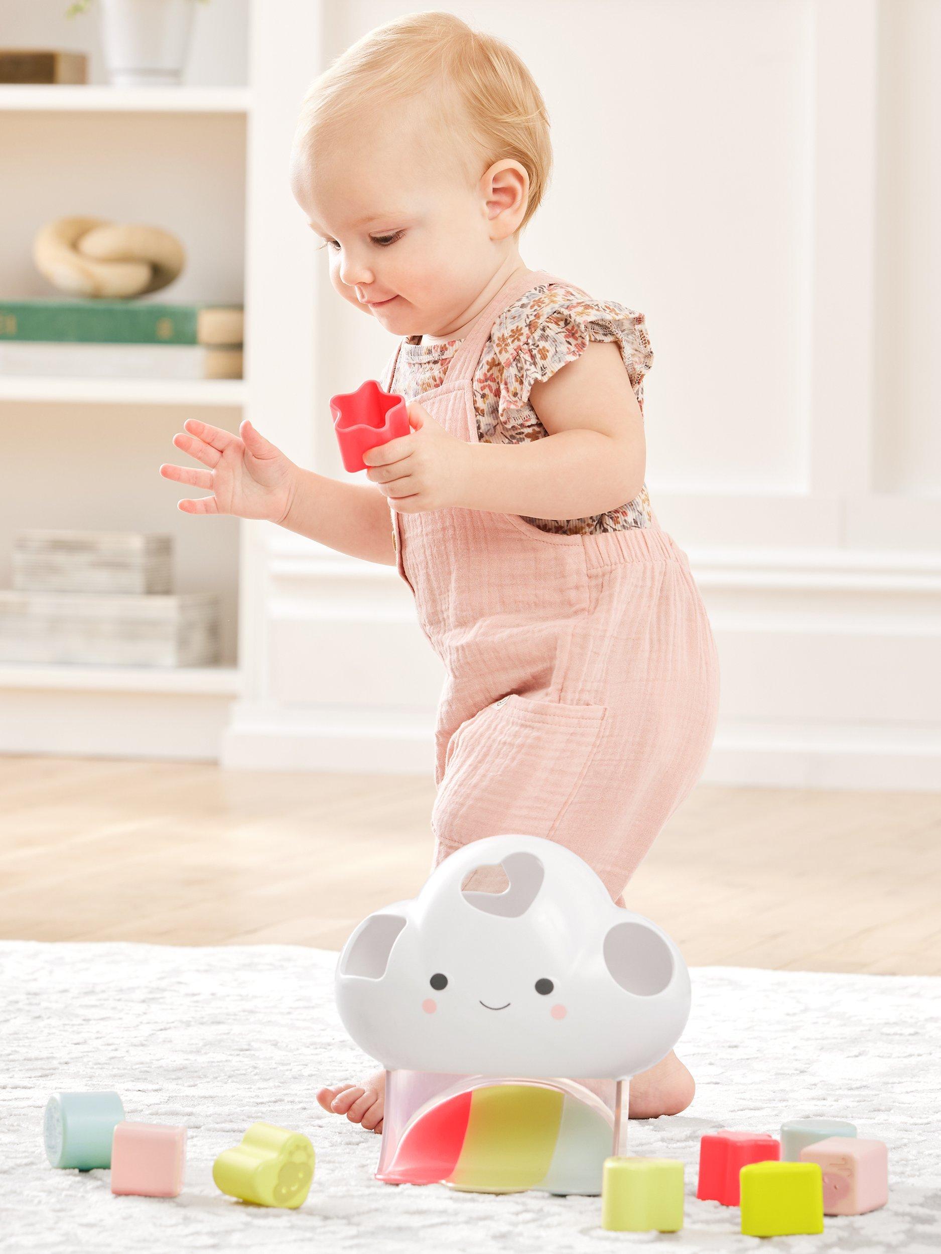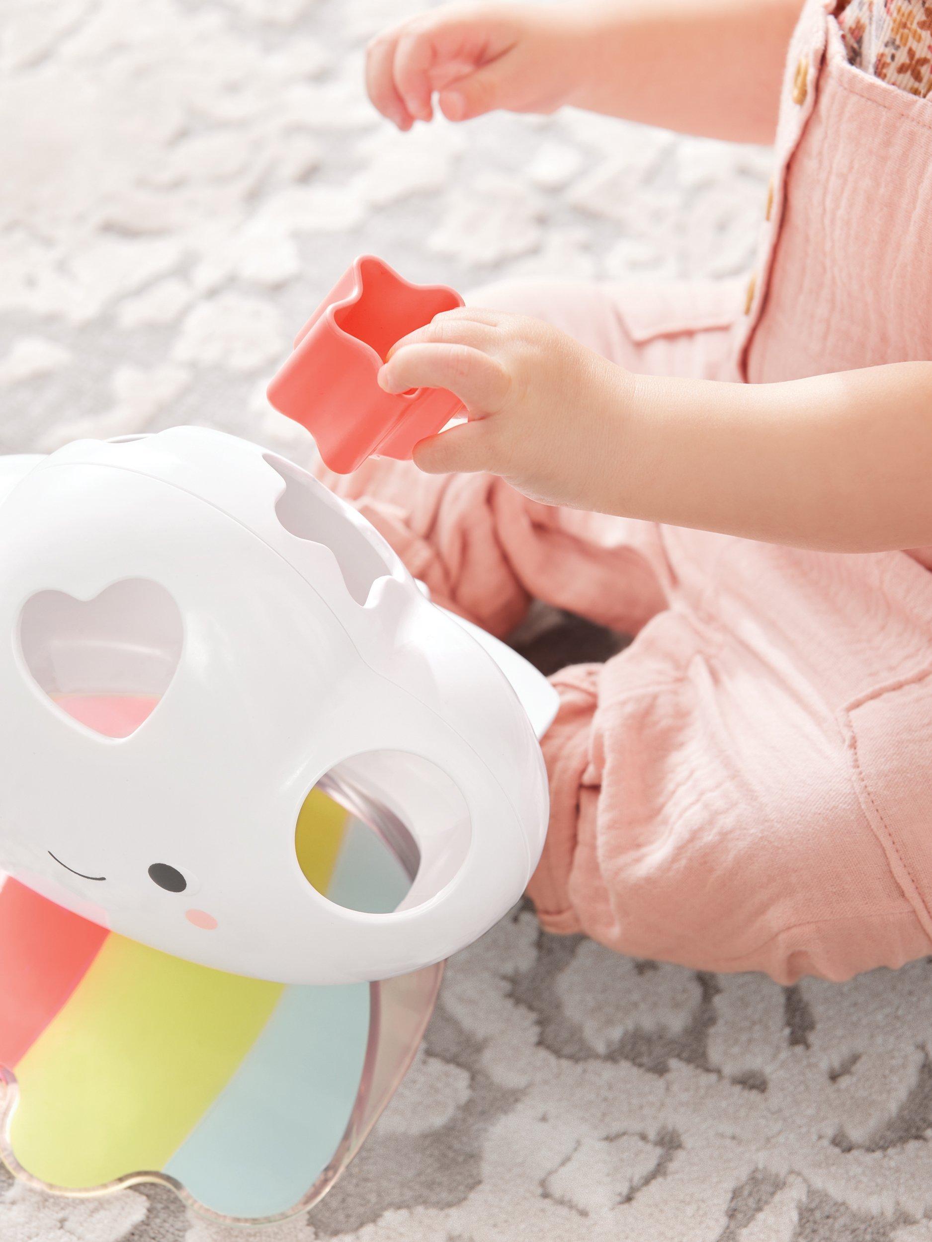 More than a shape sorter, this cute cloud friend also introduces baby to emotions, weather and colours. Featuring 10 easy-grab blocks, each of the 5 different shapes illustrates an emotion and a corresponding weather such as happy/sunny, sad/rainy and more. Little ones will love finding the perfect fit for each block and watch it slide down the rainbow!