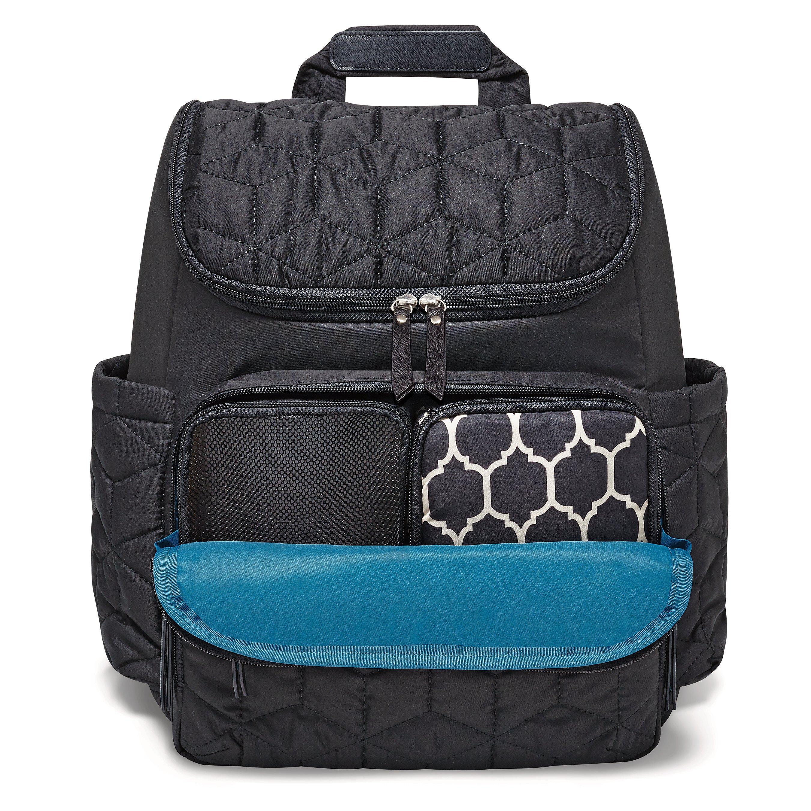 The front compartment features two multi-purpose compartments allowing for neat, extra storage. It has interior pockets and insulated side bottle pockets and the changing pad pocket also acts as a handy laptop holder.
