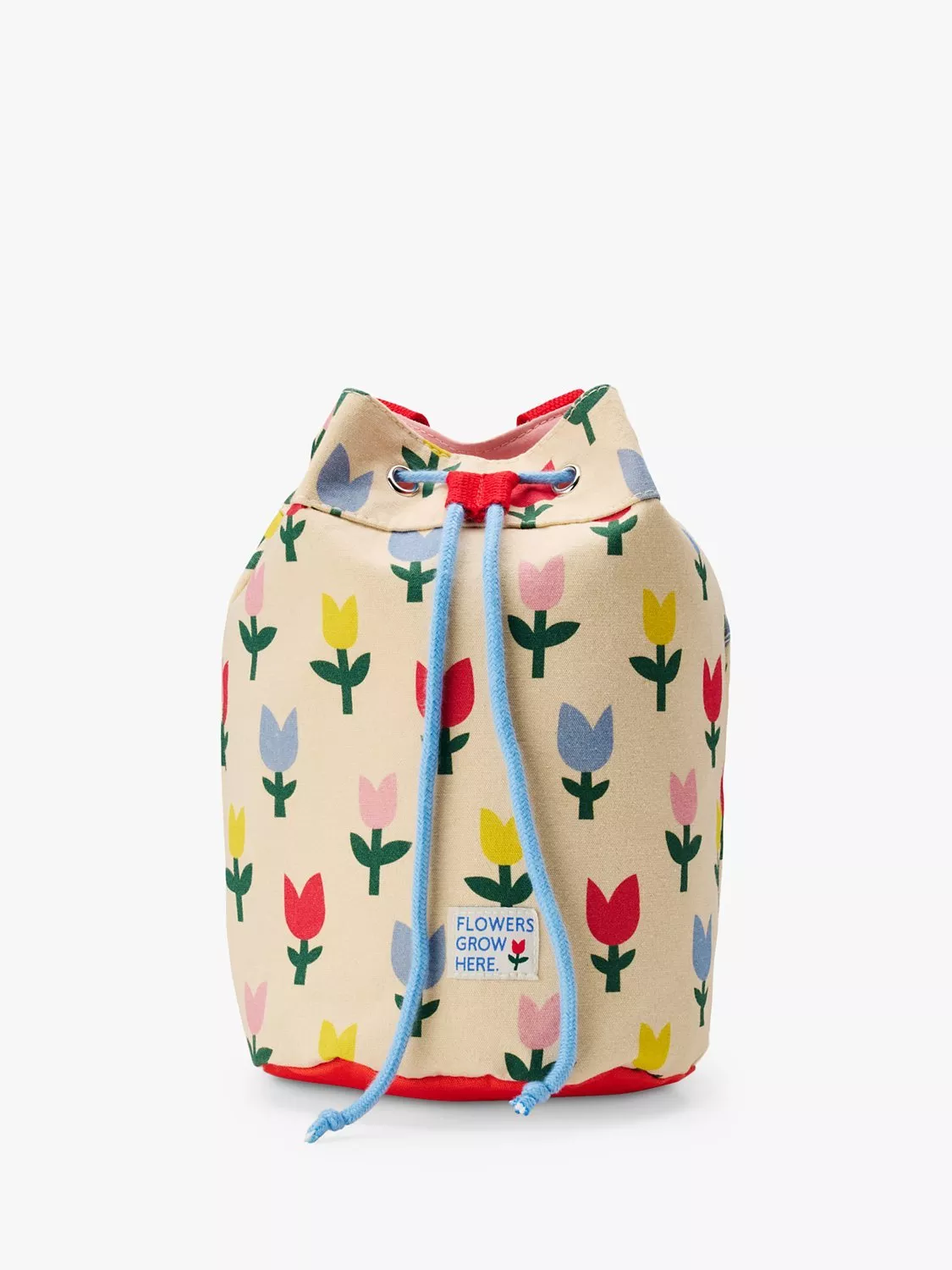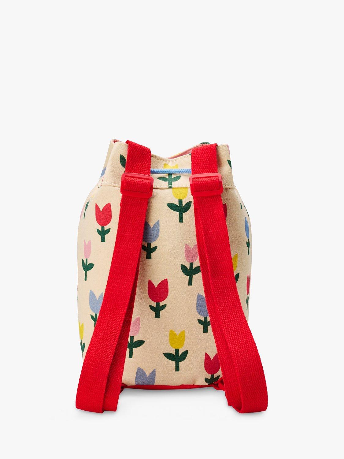Made from recycled materials in a bright tulip print design, it features two adjustable web shoulder straps and a drawstring closure.