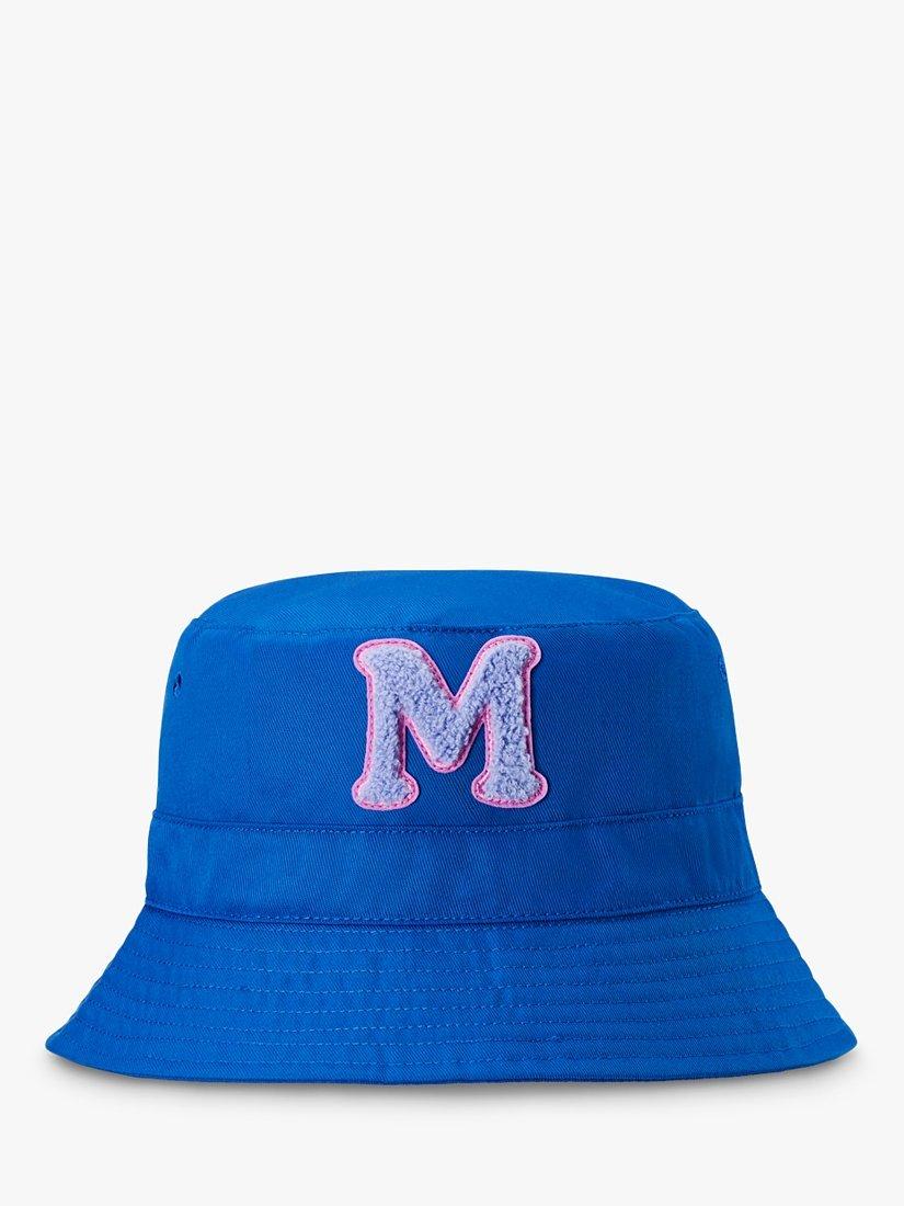 Initial design bucket hat made from recycled materials. A handy velcro chin strap completes the look. Fun and cool for beach to festival days out. Not suitable for under 3 years.