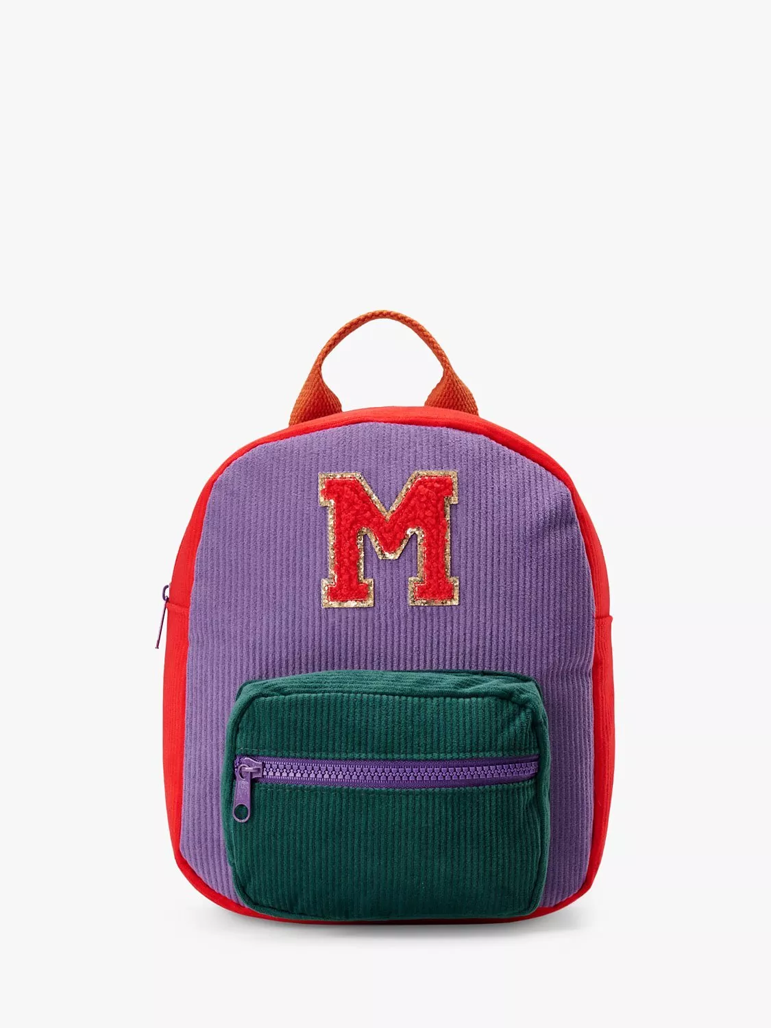 This cord backpack showcases a patch initial with a zip up main compartment and front pocket. Finished with a sturdy grab handle and two adjustable straps.