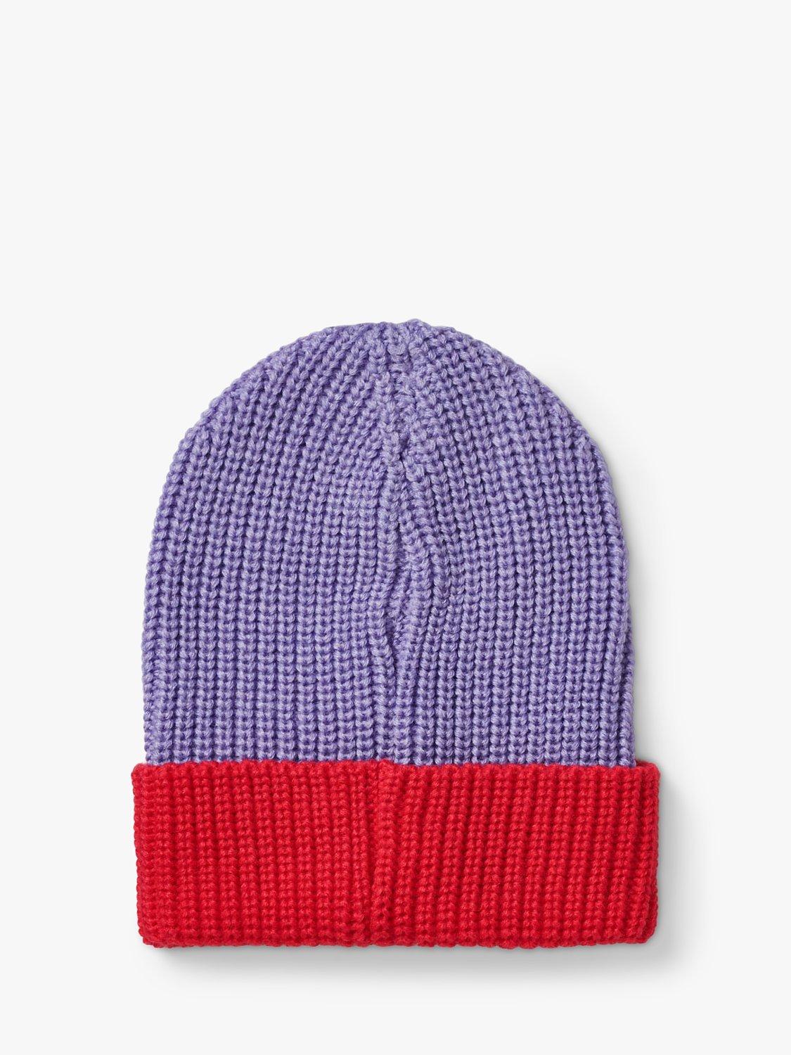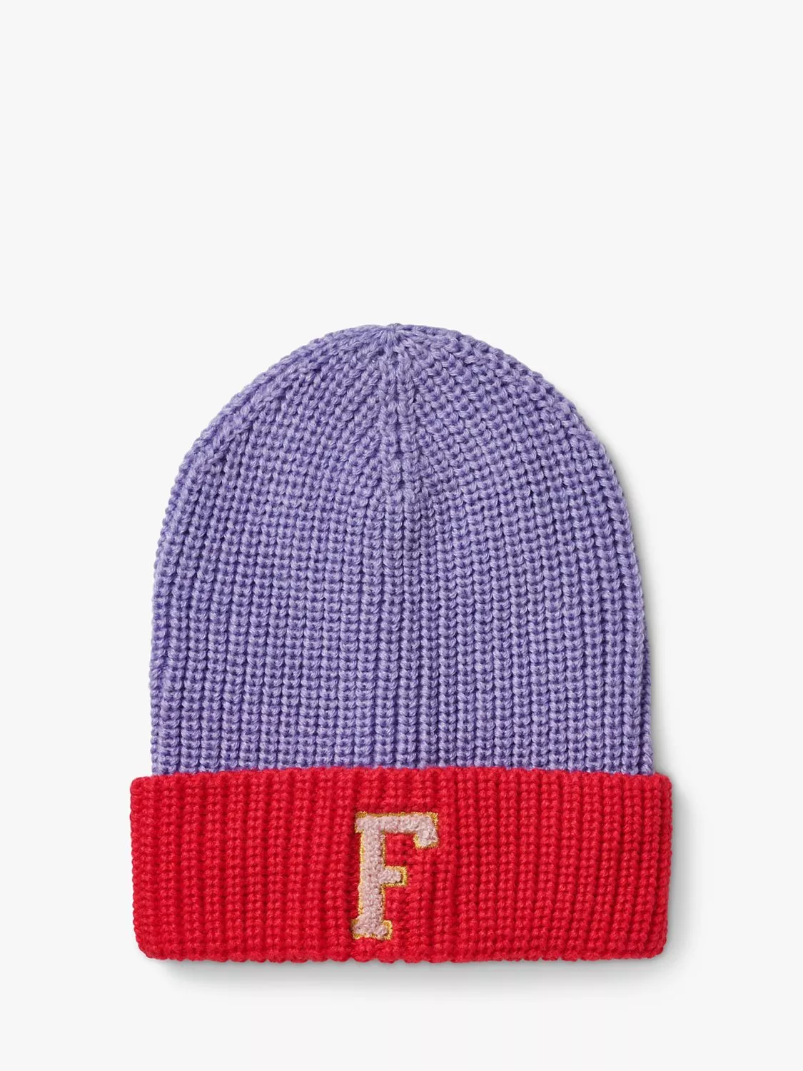A rib knit beanie hat with a turn-up brim and a patch initial.