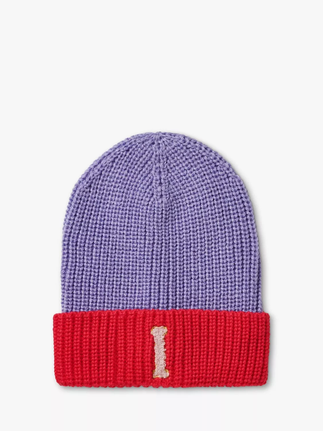A rib knit beanie hat with a turn-up brim and a patch initial.