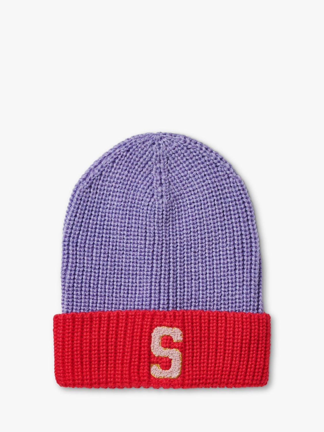 A rib knit beanie hat with a turn-up brim and a patch initial.
