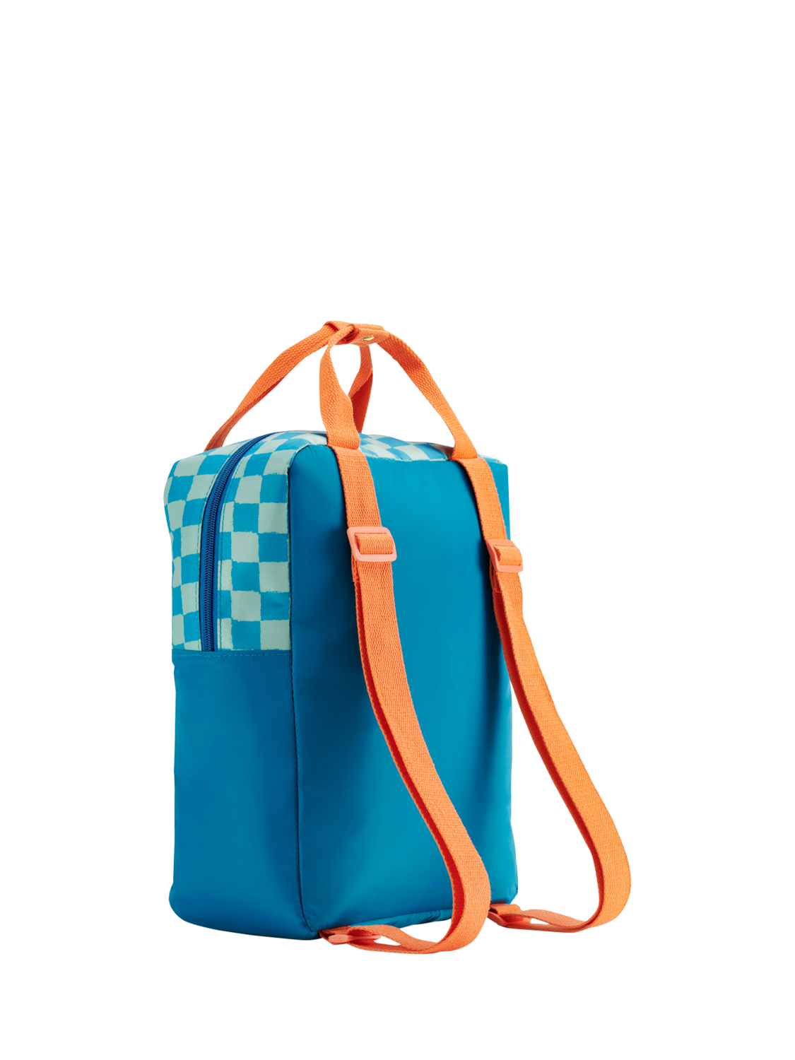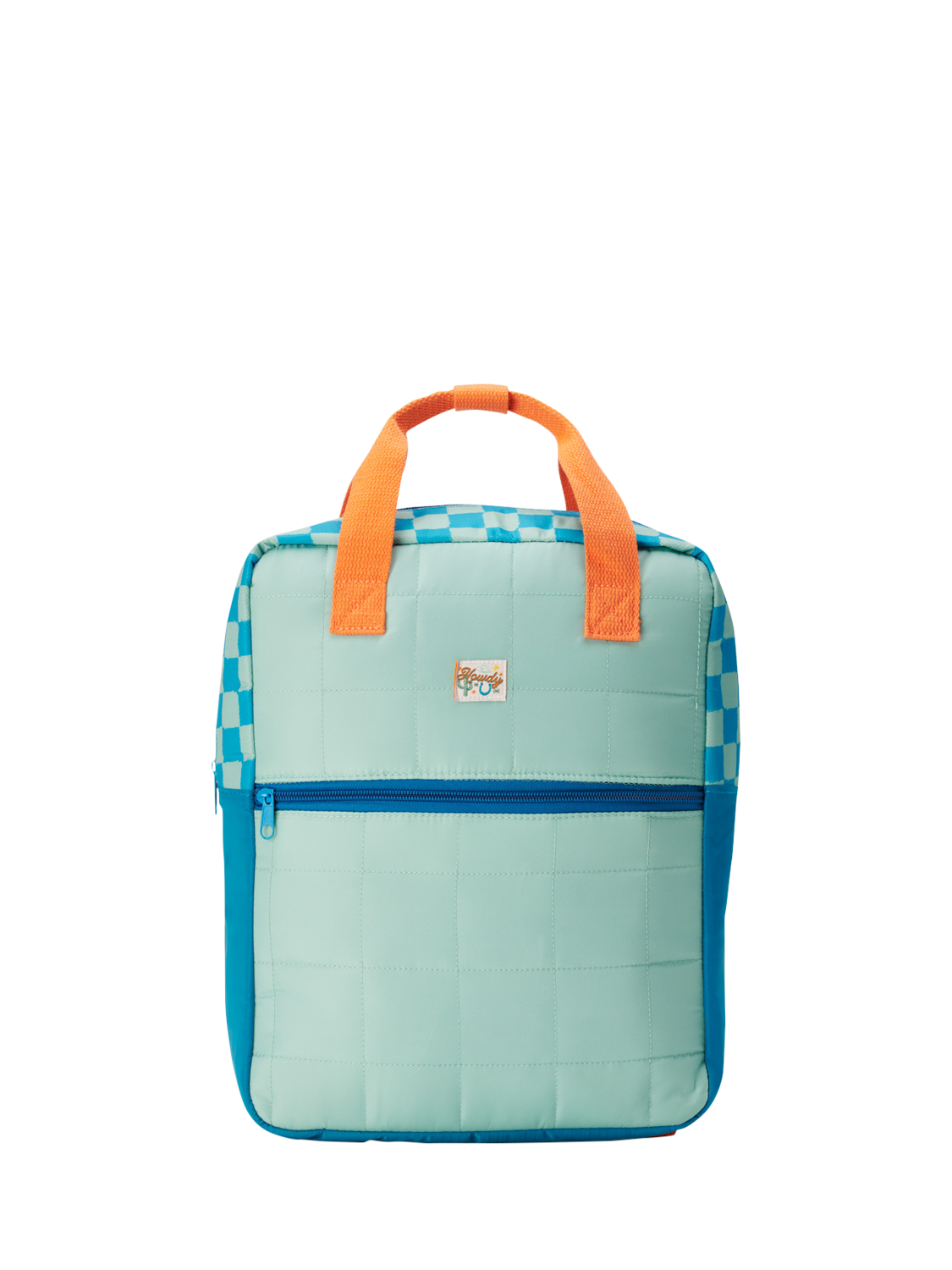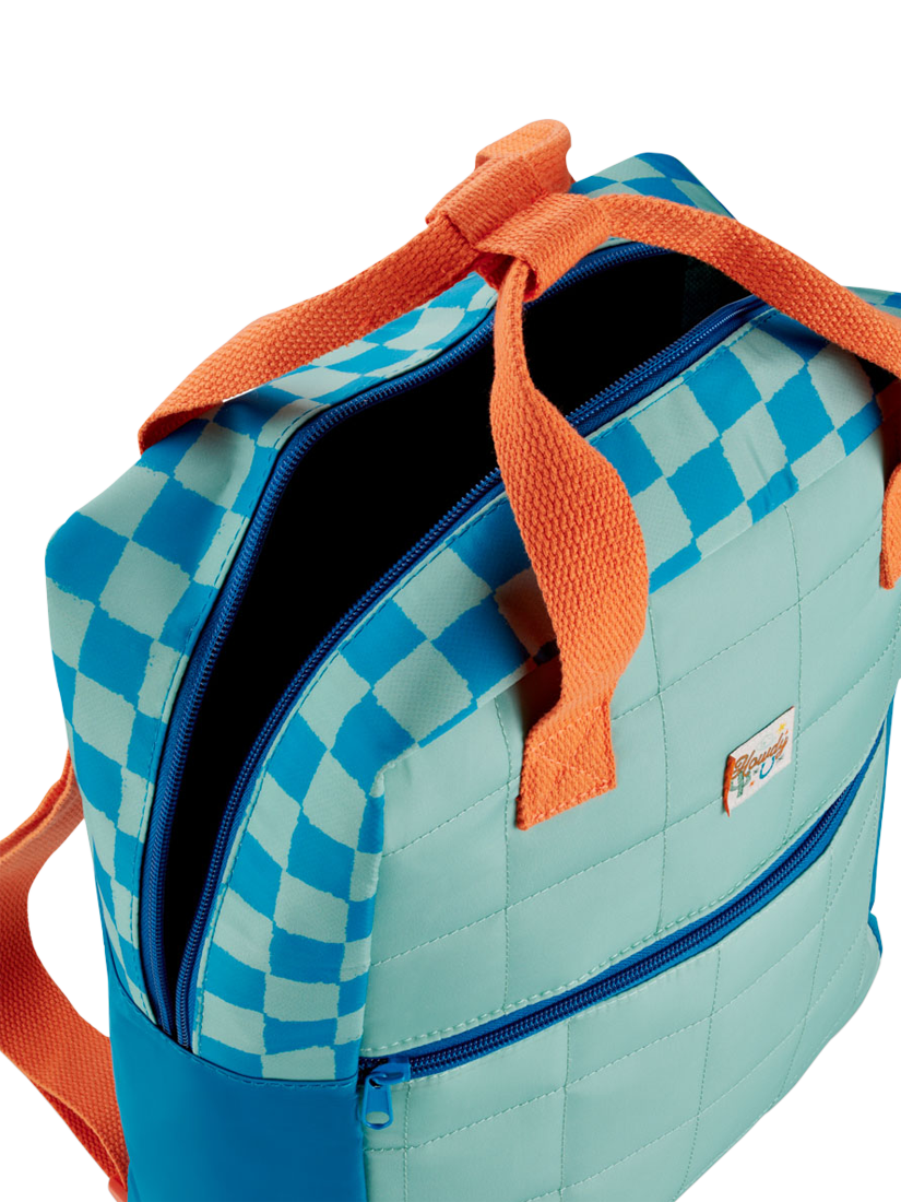Quilted backpack with check pattern detail, two adjustable straps, a hand carry strap and multiple zipped compartments.