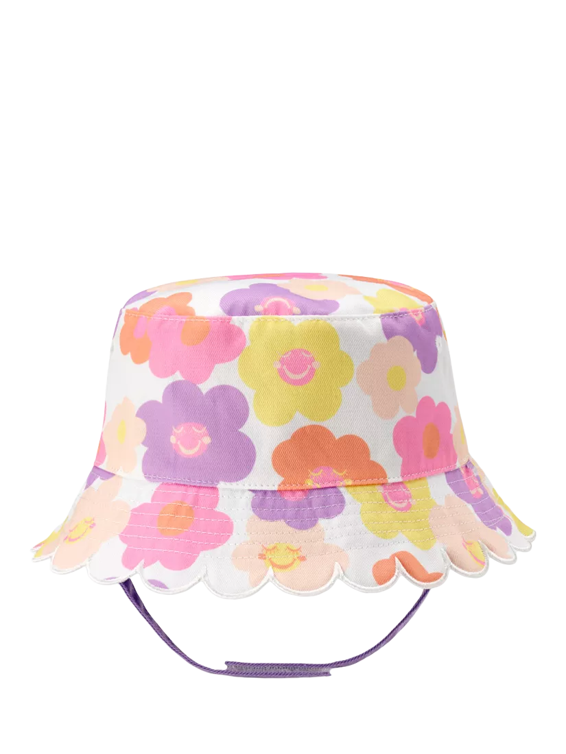Reversible scallop trim sun hat, with a rip-tape chin strap. Please note: The chin strap is only for the 3-5 years size. The 6-9 years hat does not have a chin strap.