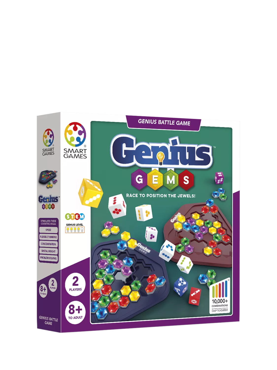 Genius Gems challenges players to race their opponent and be the first to fill the gameboard with the colourful jewel puzzle pieces. But that's not all! Genius Gems offers five levels of play, with each level becoming more challenging. Players can simply play the starter level or race through all five levels. The first to solve the Wizard level is the winner! With over 10,000 puzzle combinations possible, Genius Gems provides endless, fast-paced strategic fun.