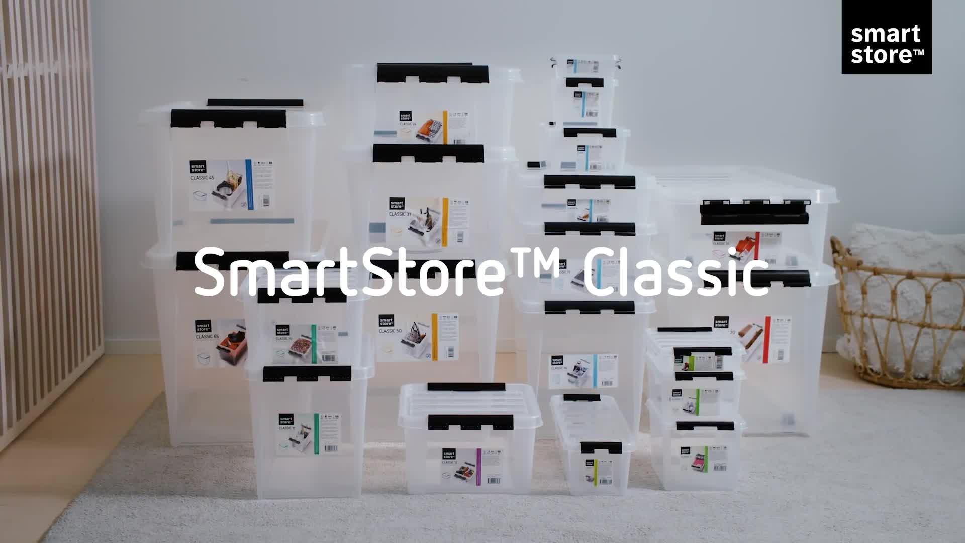SmartStore boxes nest without lids and stack with them on. 10-year guarantee.