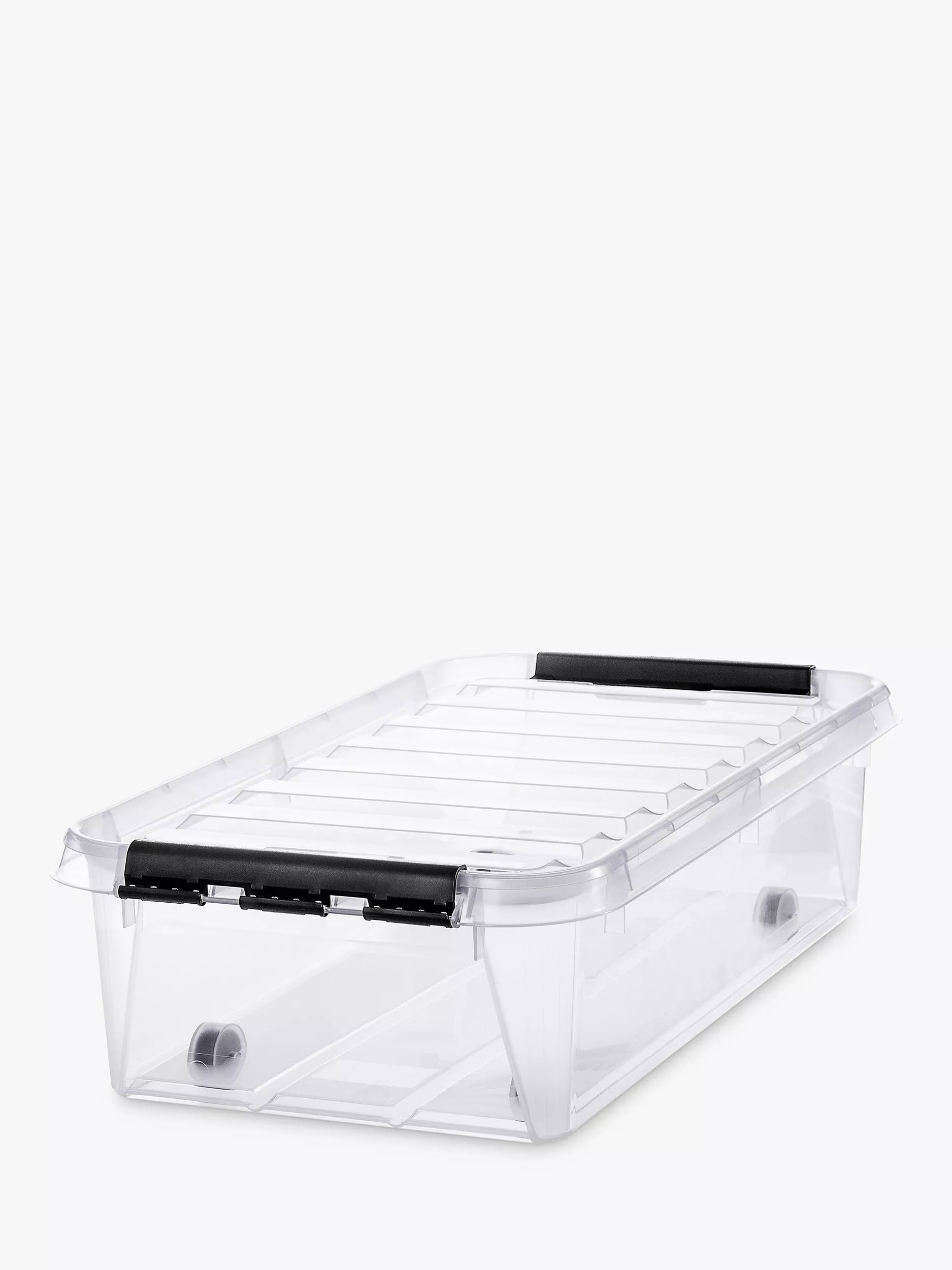 A spacious low storage box with wheels for all round storage under the bed in the bedroom. The ideal size for storing extra blankets, cushions, pillows and quilts.