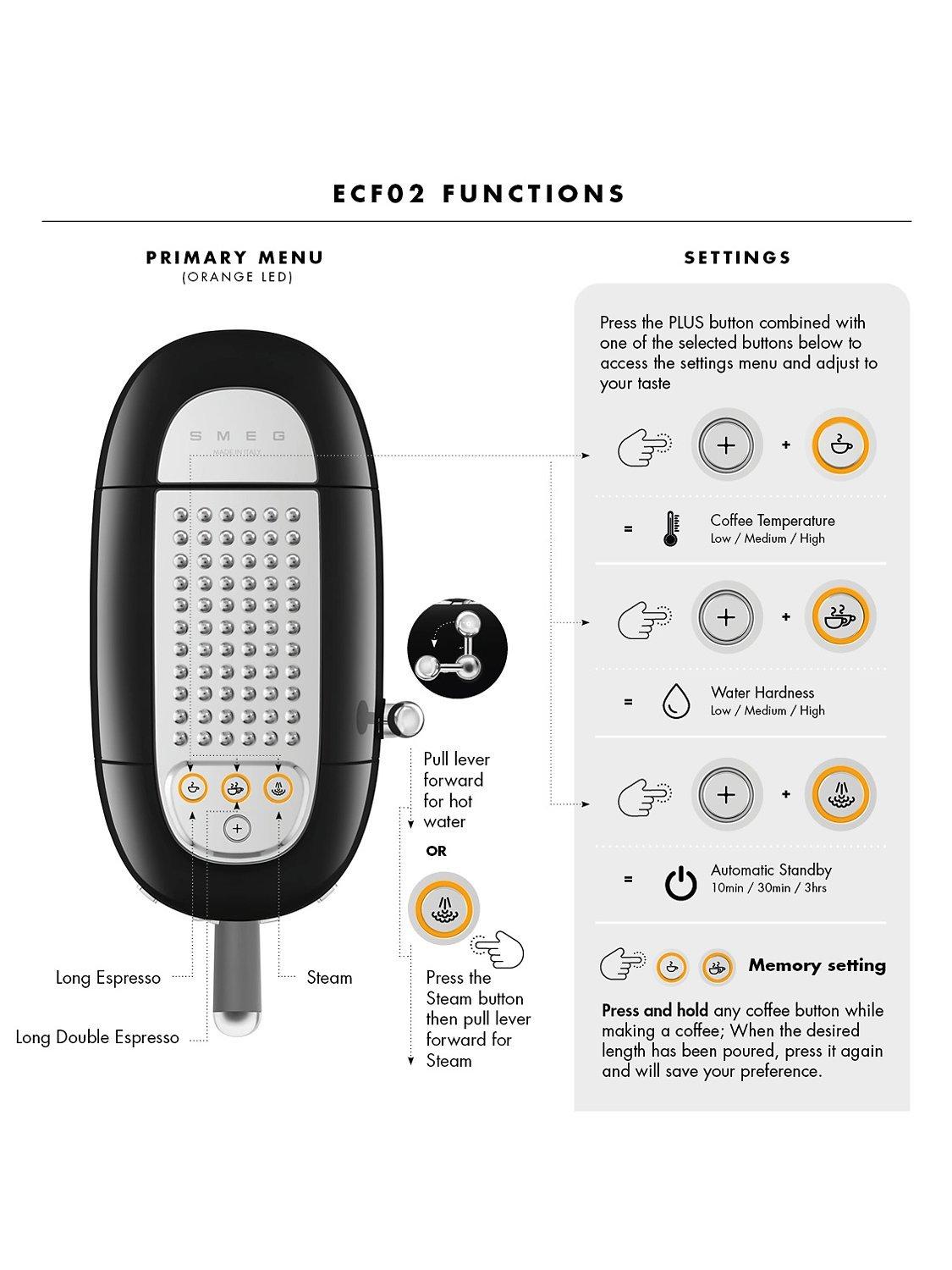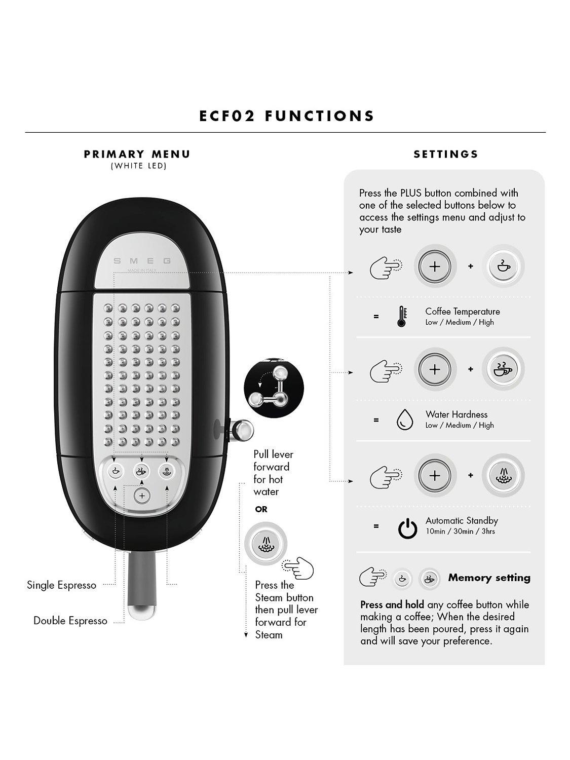 Designed with user friendly controls with adjustable settings and option to select single/double espresso and long single/double espresso or the activation of steam.