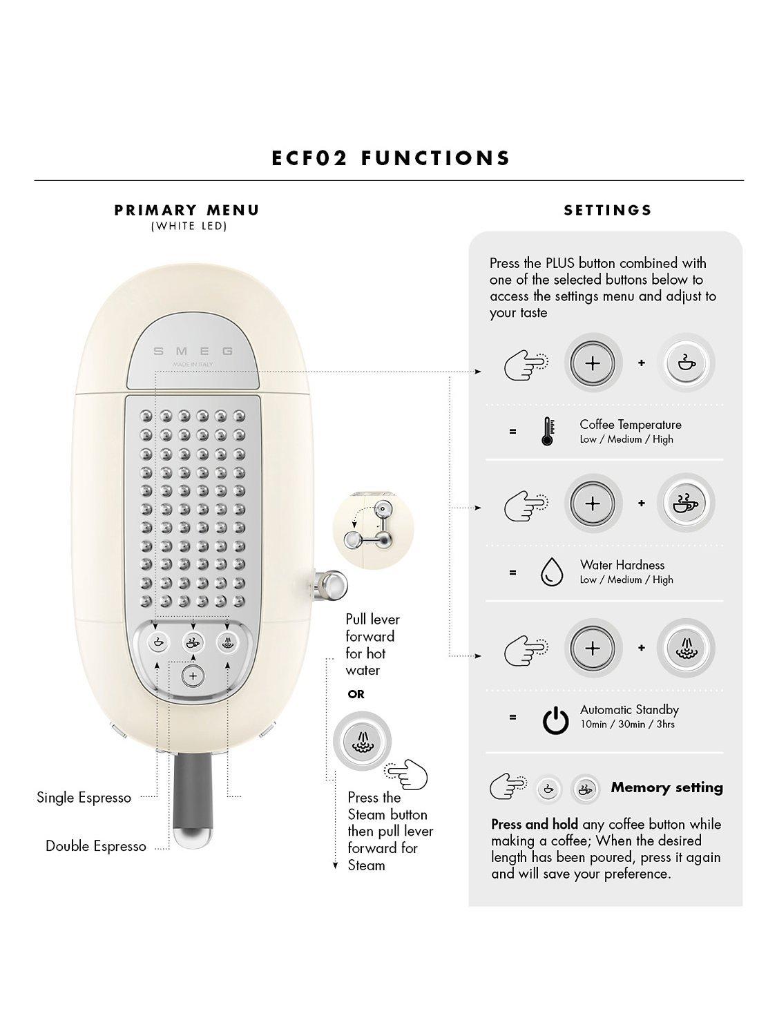Designed with user friendly controls with adjustable settings and option to select single/double espresso and long single/double espresso or the activation of steam.
