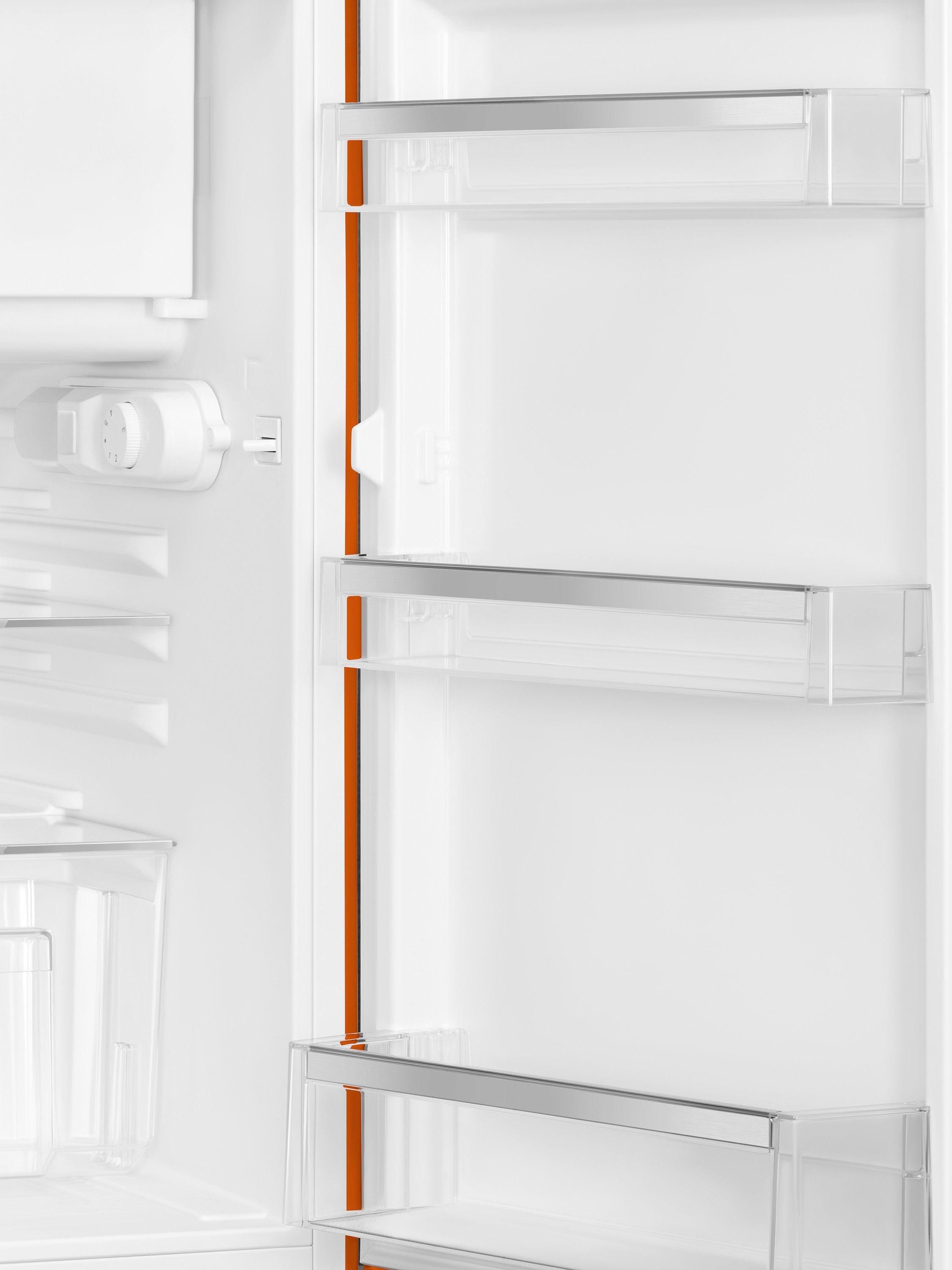 The interior features two adjustable shelves and one shelf which covers the fruit and vegetable drawer, as well as a small ice box. In the door, there is further storage, perfect for bottles and cans.