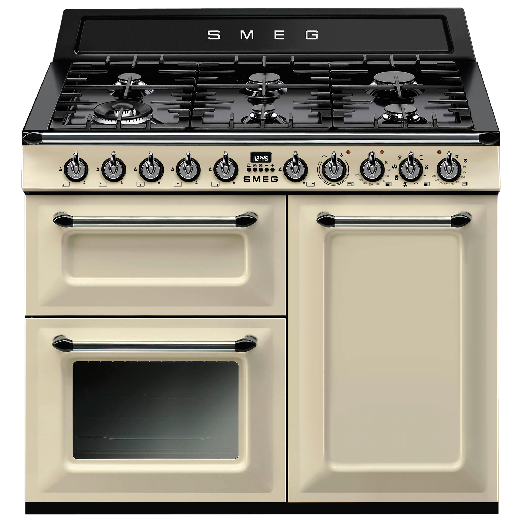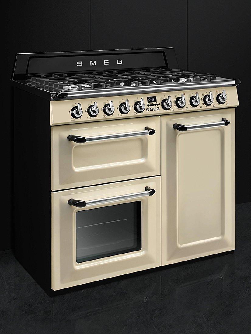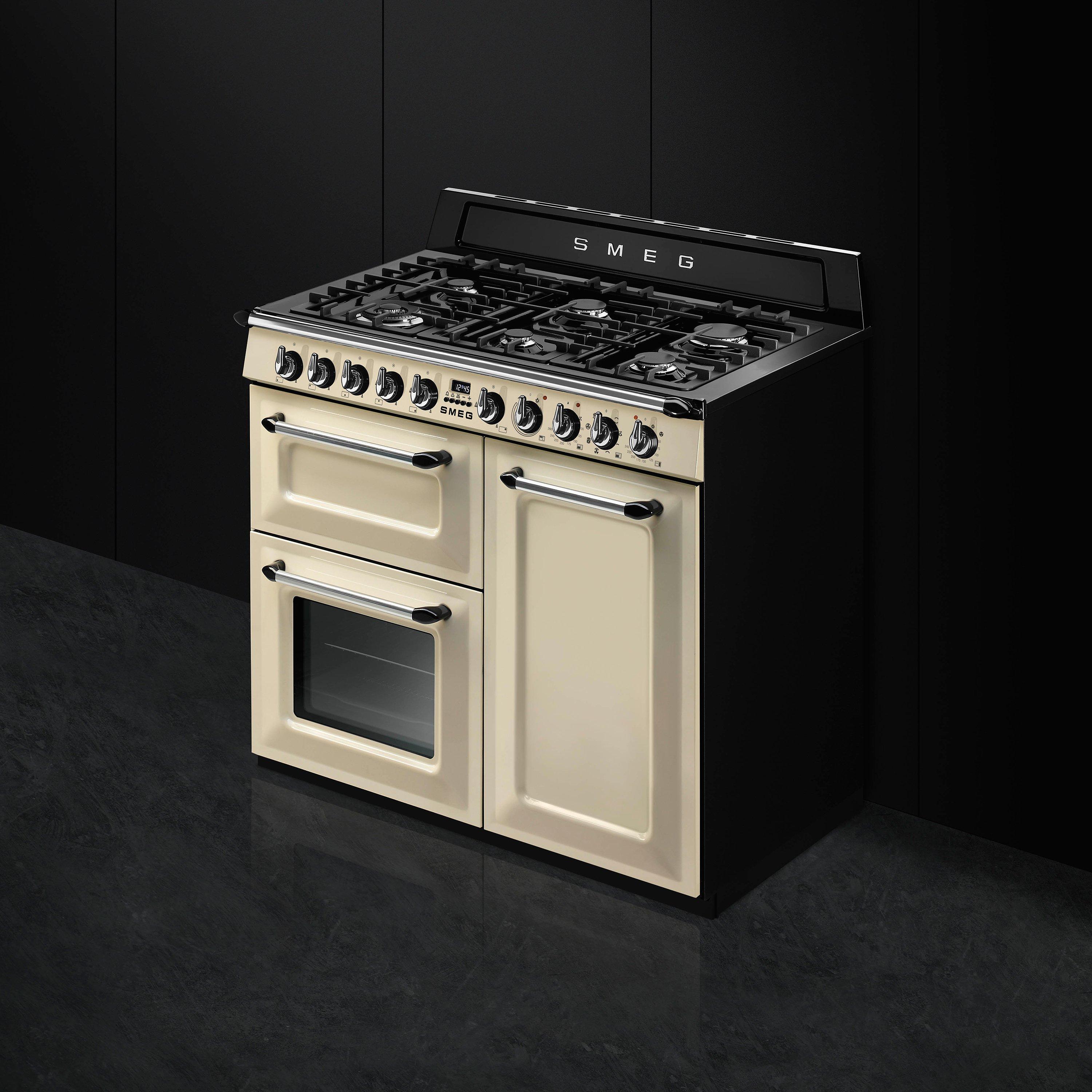 The TR103 dual fuel cooker from Smeg is a 3 cavity range cooker offering a variety of cooking functions and flexible cooking space.