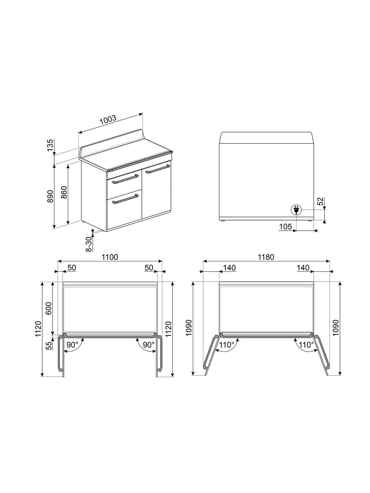 H 860mm-890mm 1025mm (Including upstand) W1100mm D 655mm (1120mm when doors open)Minimum distance between hob & cooker hood required