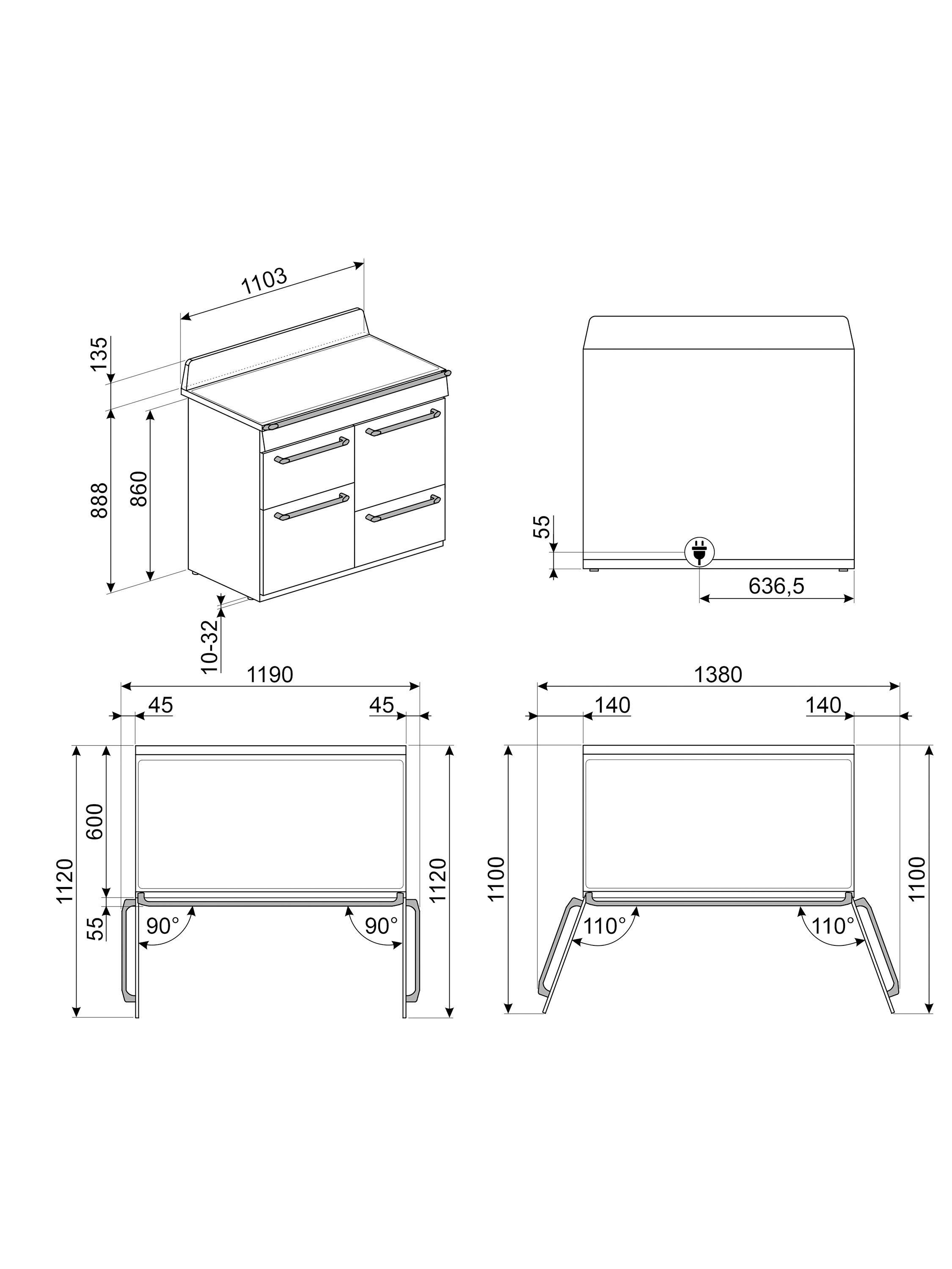 - H 860mm-888mm 1023mm (including upstand) W 1103mm D 600mm 655mm (including handle) 1120mm (door open)