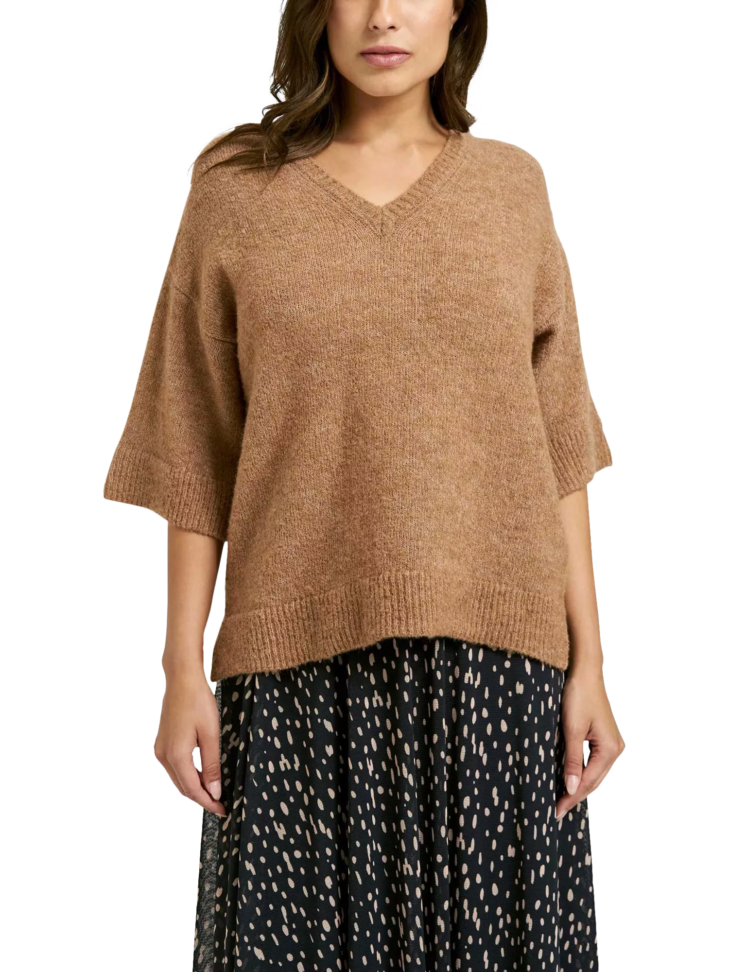 This relaxed-fitting lightweight boucle jumper has been knitted from a knit blend, making it super comfortable to wear. It has a boxy fit with dropped shoulders and half sleeves. Other features include a feminine v-neckline, cuffs and hemline with ribbed details.