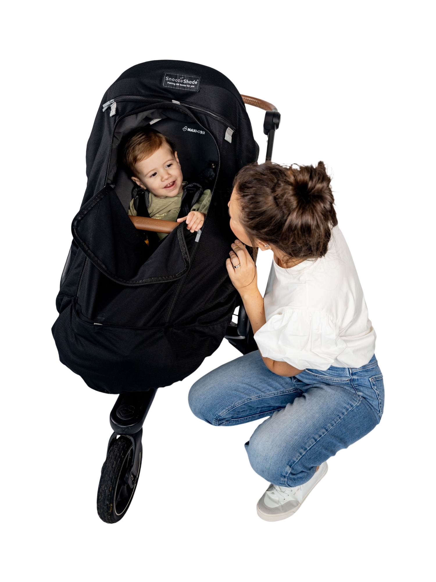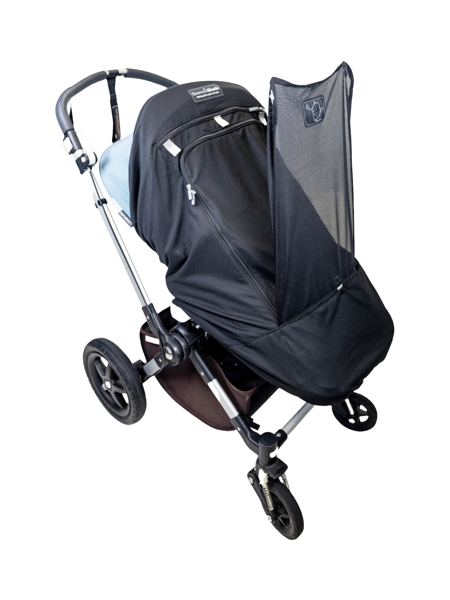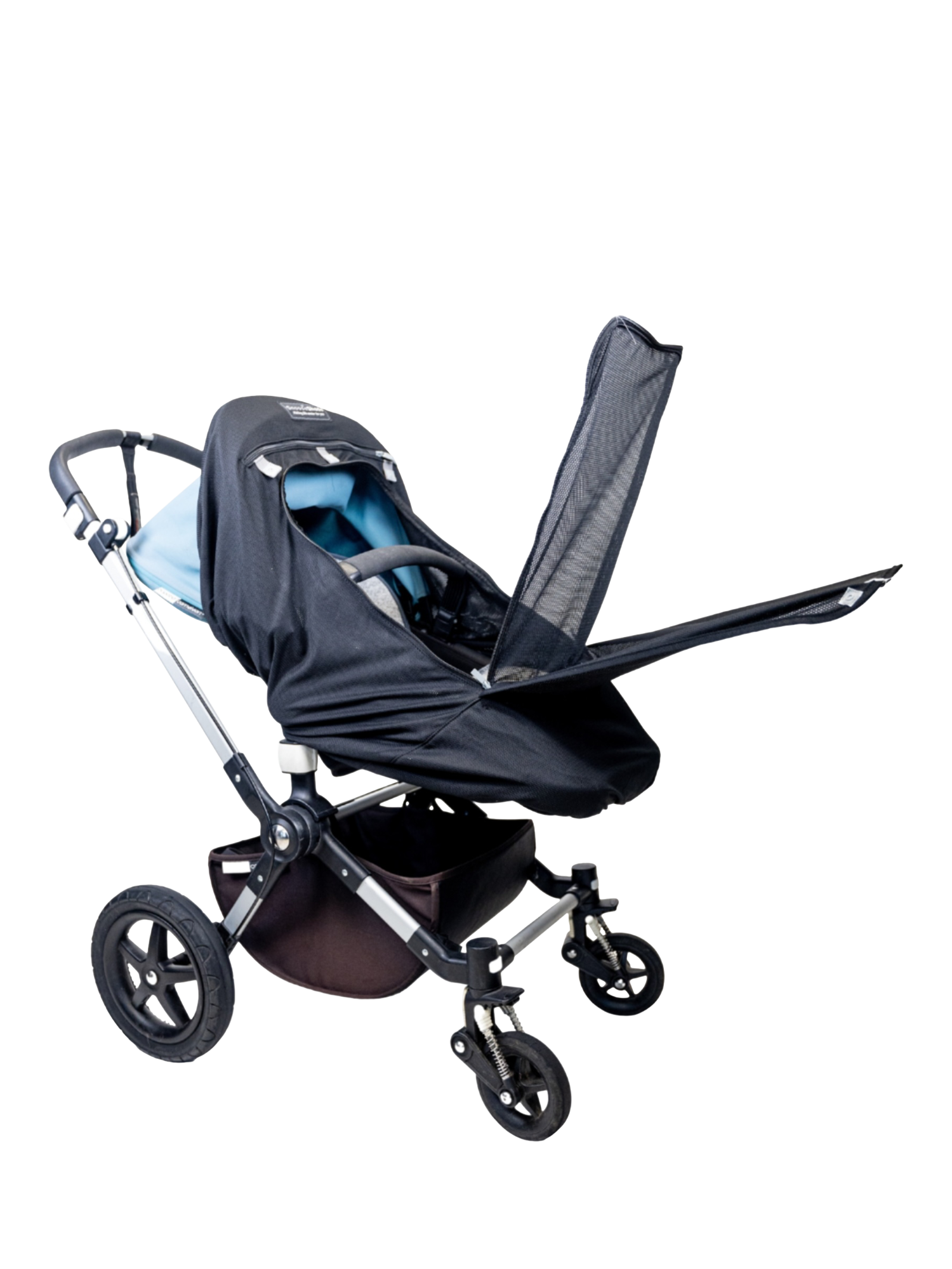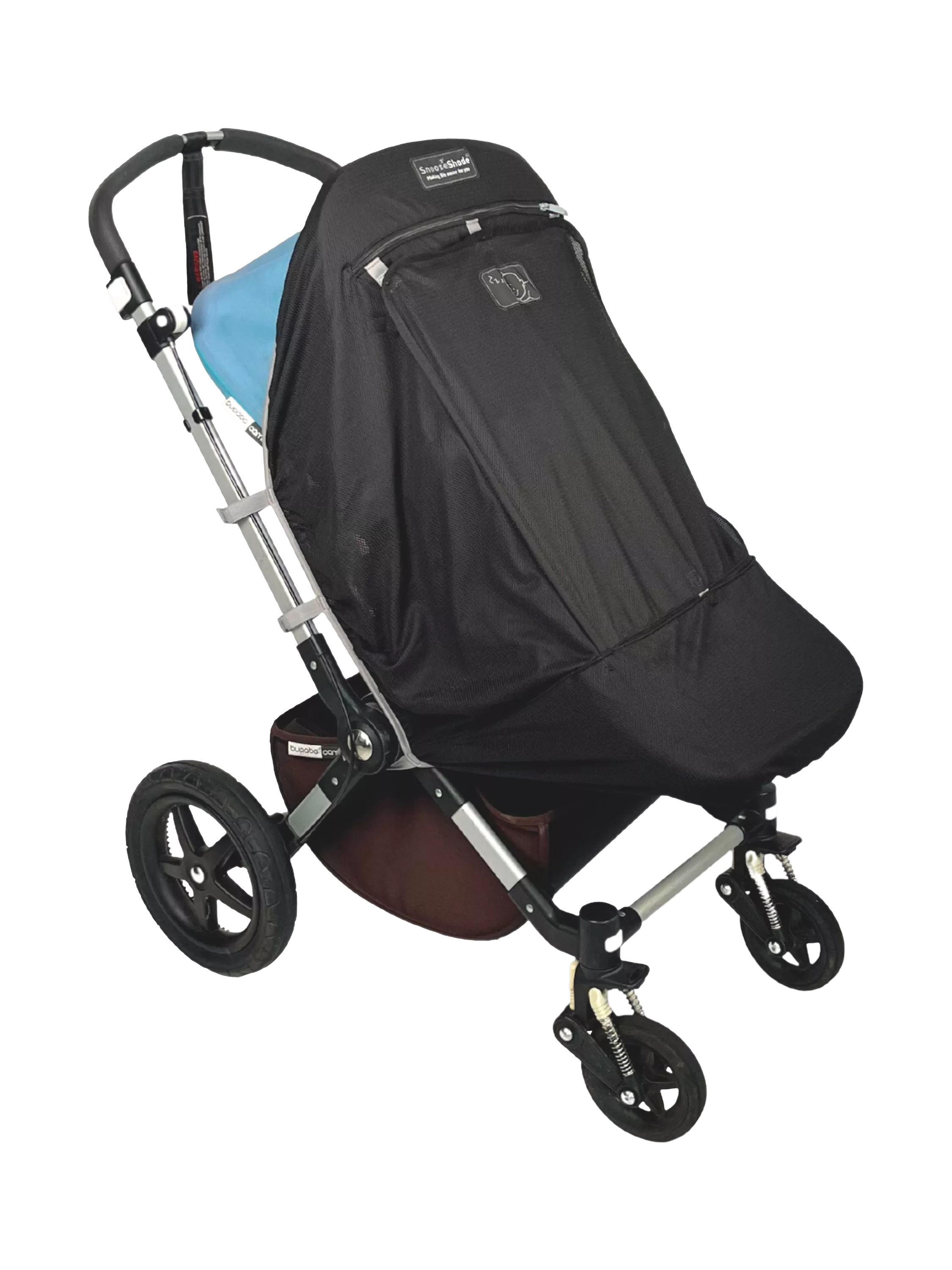 Shield your baby or toddler from sun, insects, wind, and light with SnoozeShade Plus Extra. Designed for use once baby moves into a stroller seat, it fits all single pushchairs and buggies and can be used at any age and in any seat position — upright or reclined. The inner shade panel blocks UV and reduces visual stimulation for daytime naps on the go. The outer snooze panel zips over for deeper sleep, creating a double layer that blocks up to 94% of visible light. The air-permeable mesh also acts as an insect and mosquito net.