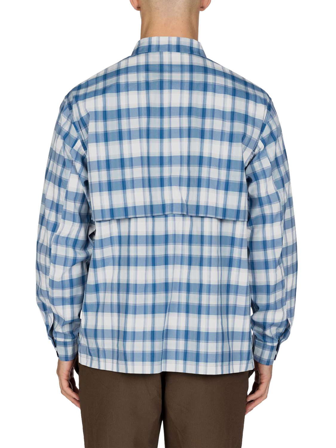 Check shirt with a front opening featuring snap buttons for easy on and off, while the collar design offers a two-way style: by shifting the second button's position, opening the top button transforms it into an open-collar.