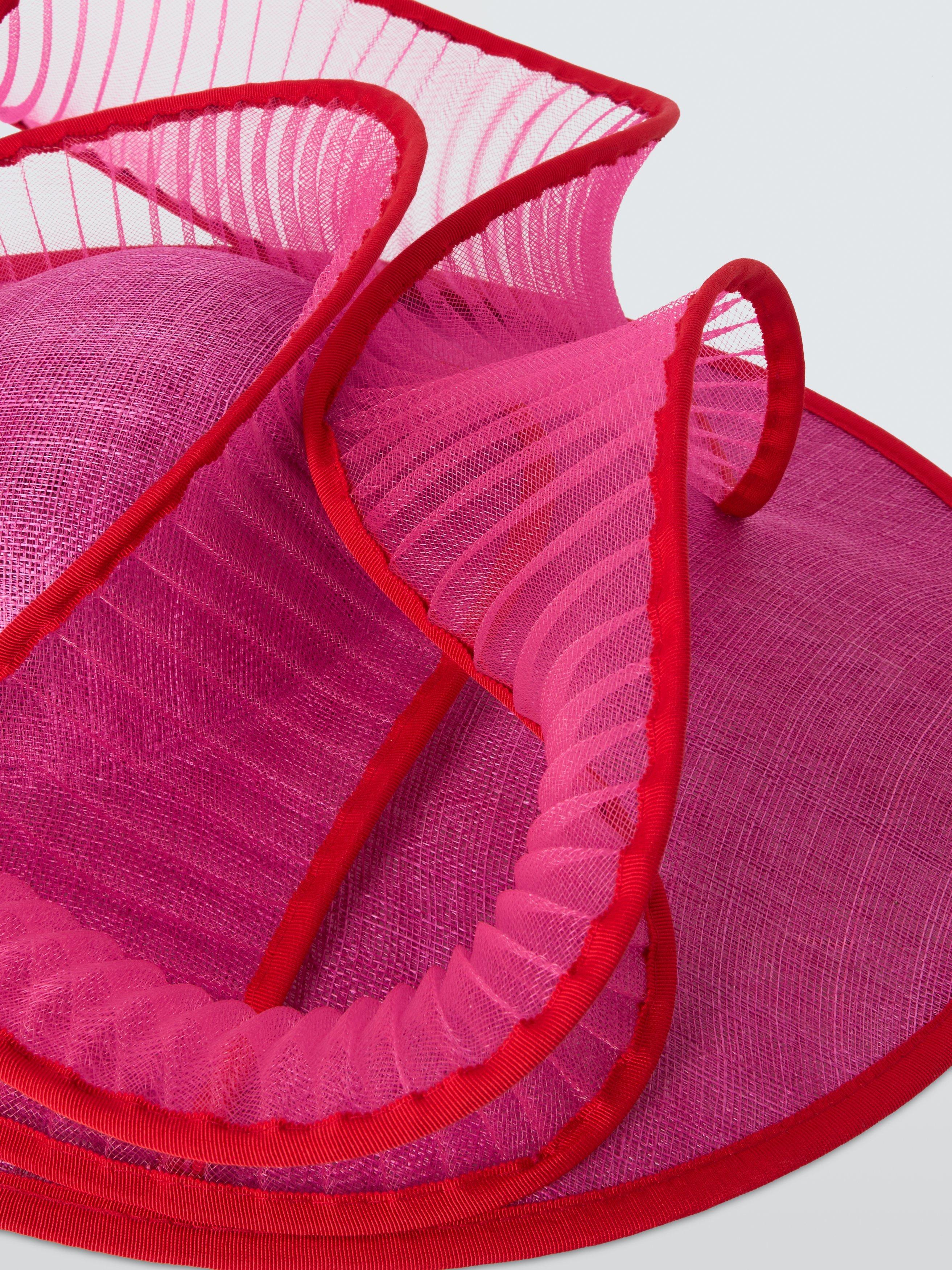 Large disc occasion hat with dramatic sheer swirl detailing and bold trim.