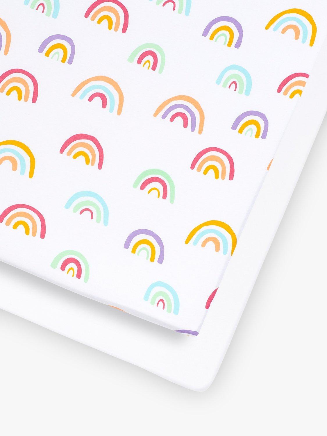 Consisting of one sweet rainbow print and one plain fitted sheet, this set fits cots and cotbeds from 60x120cm min to 70x140cm max.