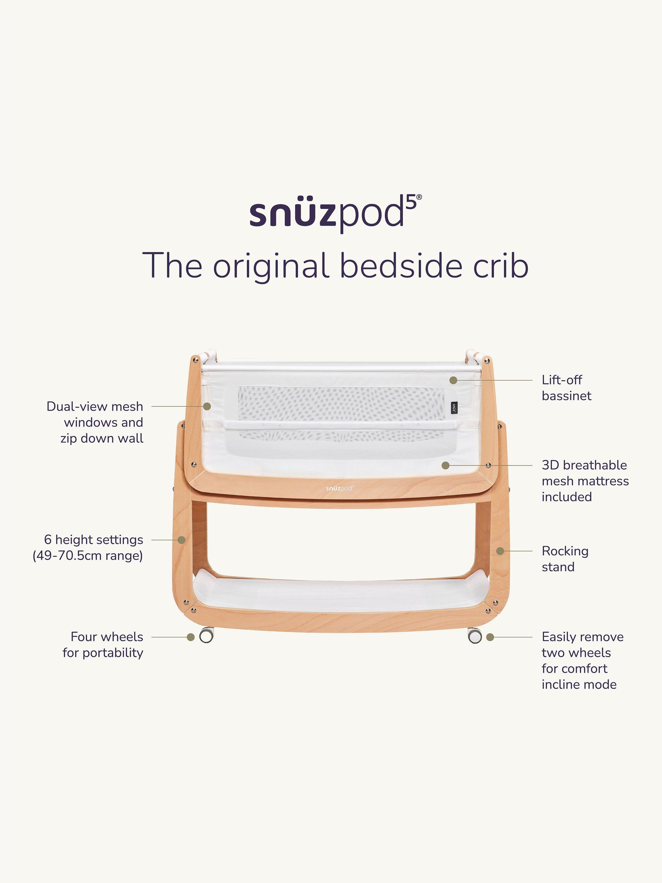 Bring your baby home and nurture them through their first six months in ultimate luxury for their first bed. SnuzPod combines the safety and flexibility of intelligent design, with the style and durability of furniture. Breathable mesh windows and a 3D mesh mattress help to keep them cool, whilst the lift-off bassinet and wheels keep them close. Sleep well, feed easily, and be closer to your baby with SnuzPod5.