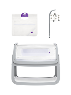 The SnüzPod4 bedside crib bundle is designed for safe overnight sleeping and daytime naps. It includes the SnüzPod4 bedside crib, a storage pocket with multiple handy compartments (1x dummy pocket, 2x elasticated mesh pockets, 1x large inside zip pocket), and a matching Scandi-inspired baby mobile. With its lightweight lift-off bassinet, the SnüzPod4, is designed for easy use around the home.