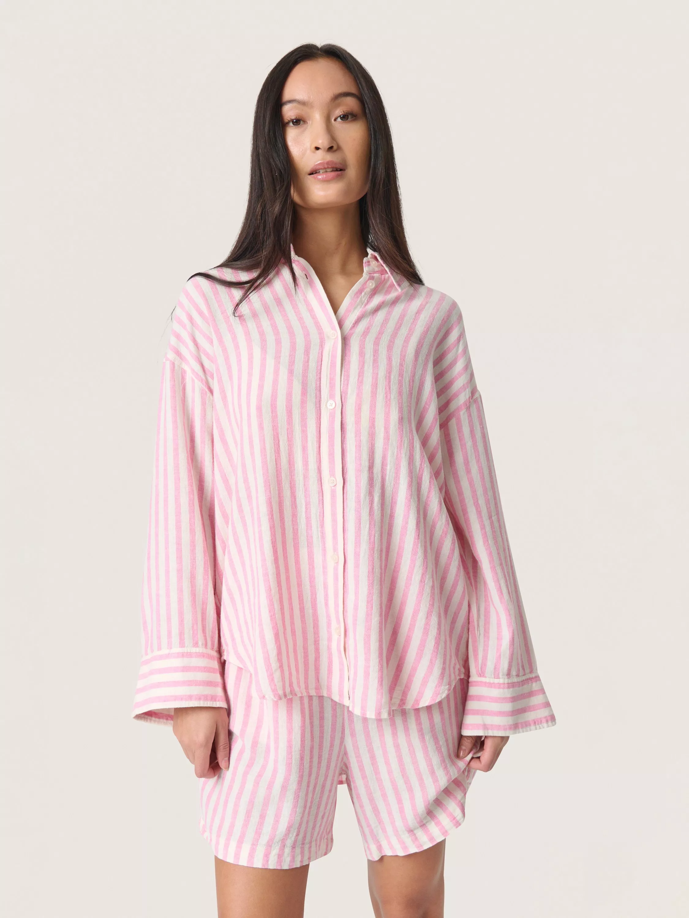 Elevate your style with the Beliro shirt from Soaked In Luxury, crafted from a linen blend for exceptional softness. Featuring chic pink and whisper white stripes, perfect for any occasion.