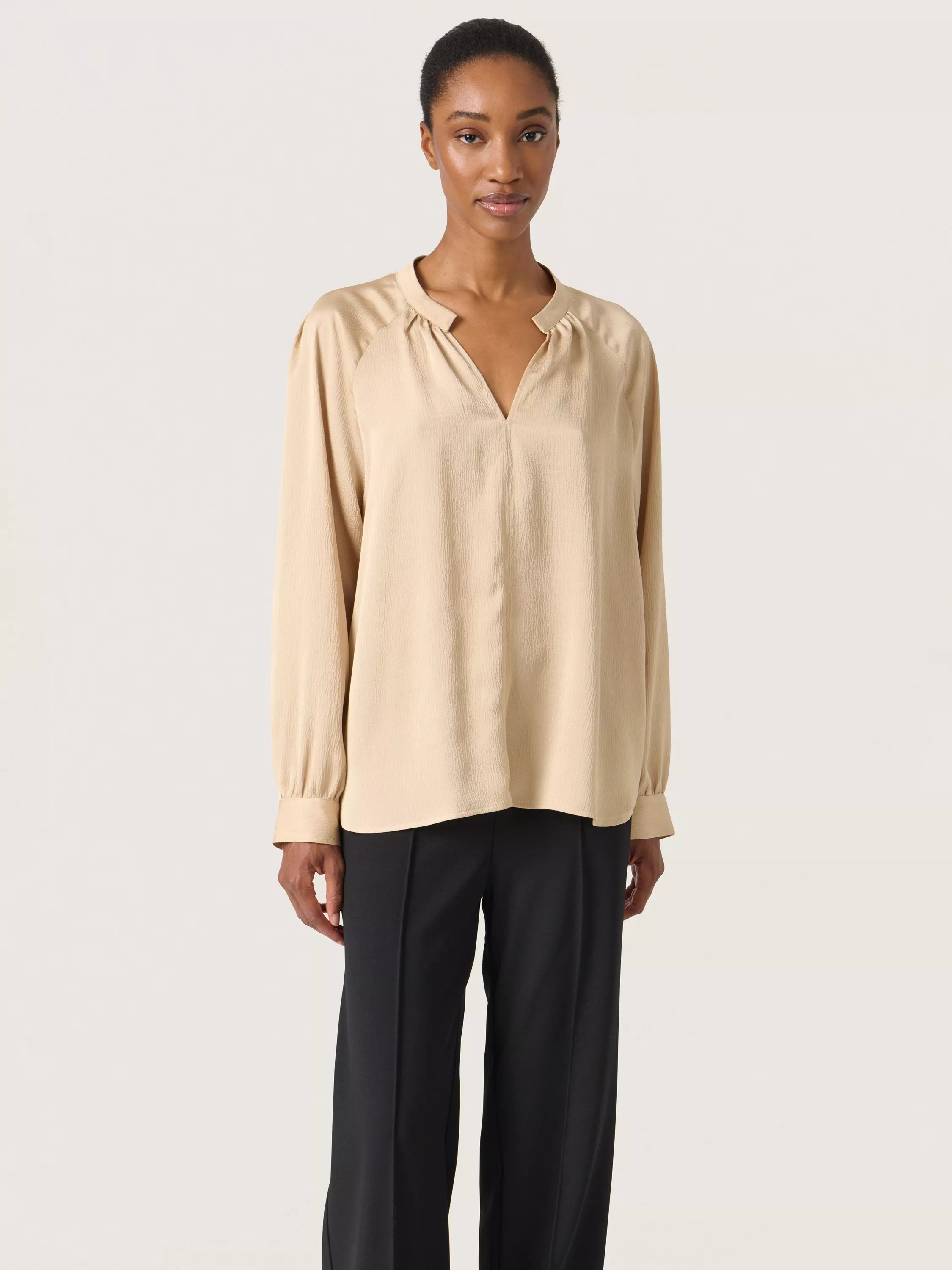 The Ioana blouse is an elegant style, that you can use anywhere and style with anything. It has a V-notch neckline with a band collar and it has a casual fit. The sleeves are long raglan sleeves with a relaxed fit, and they are gathered in a buttoned cuff.