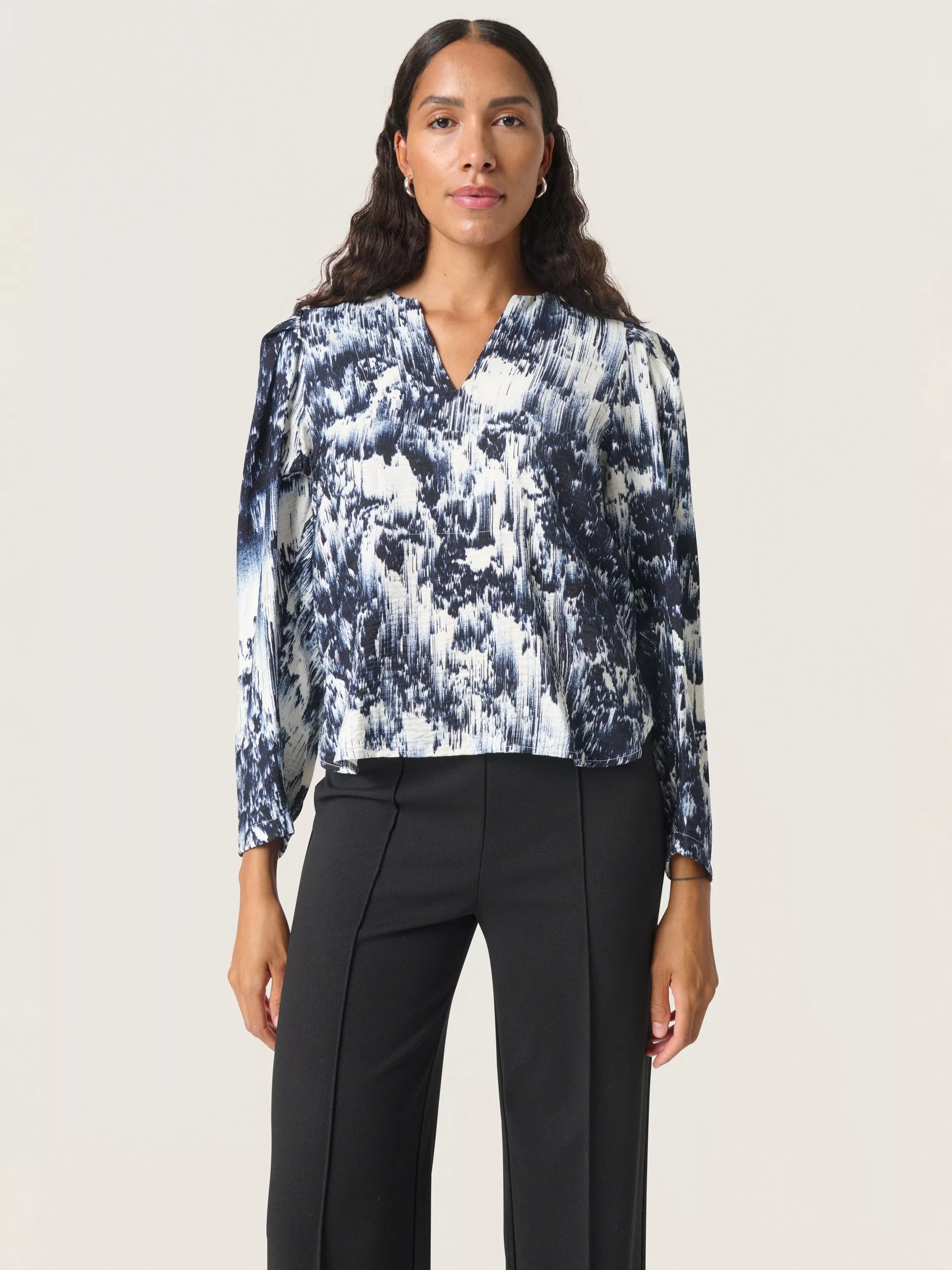 With it's beautiful print and soft silhouette, the Jazzlyn blouse is the perfect top to add to your wardrobe this season. It has a V-notch neck and a regular fit, and it is cut at the hips. The sleeves are 3/4 length with pleats and added volume at the shoulders, and they have a tapered fit.