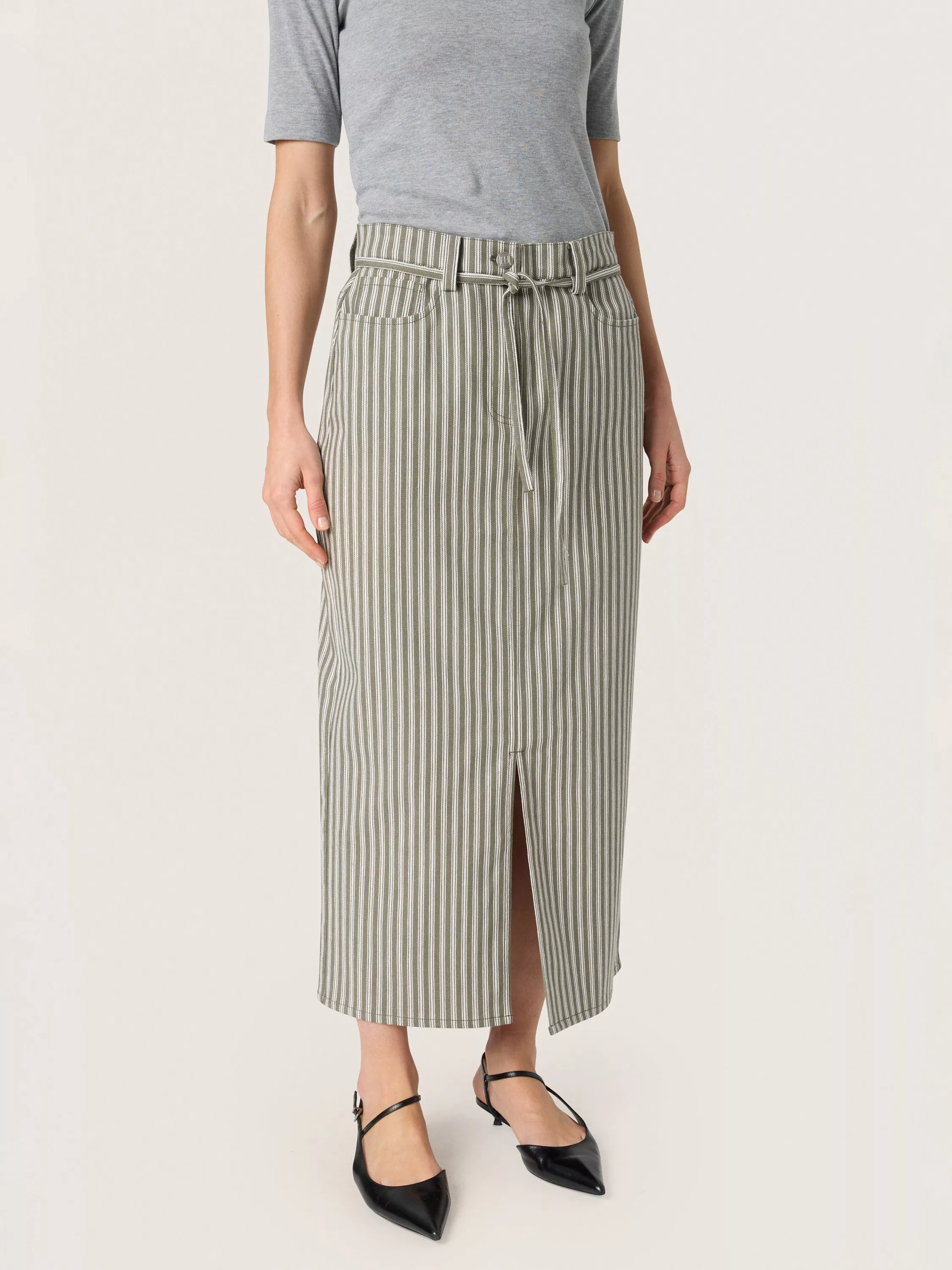 Saying yes to separates, this tie waist midi skirt from Soaked In Luxury features classic striping across its canvas. Blended with cotton, it's a breath of fresh air in casual combinations.