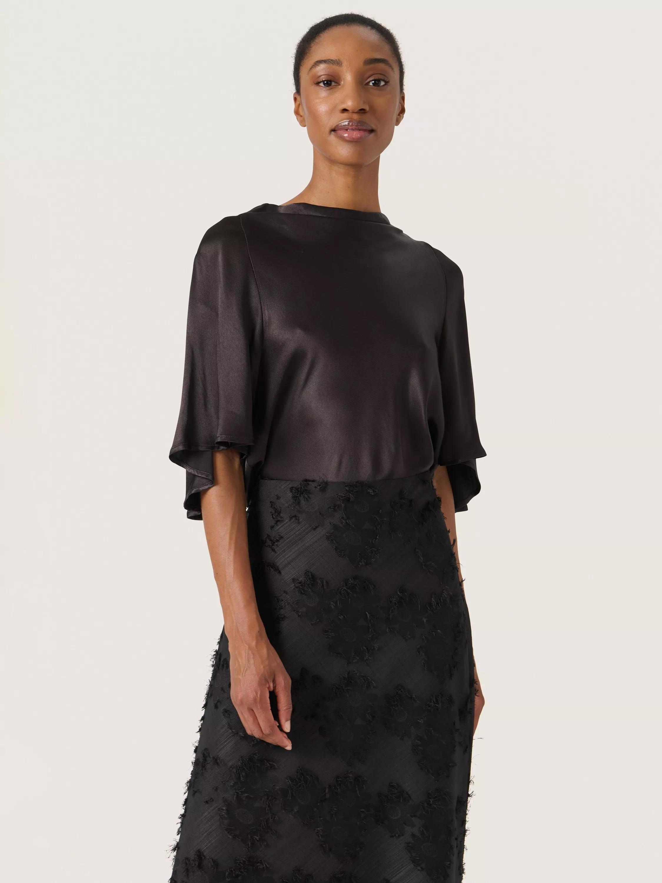 The Milu blouse is an elegant and beautiful top, that will elevate any outfit. It has a cowl neck with a cutout at the back, and it has a regular fit and is made in a soft satin fabric. The sleeves are half-length raglan sleeves with a flowy flutter fit, and the top is cut at the hips.