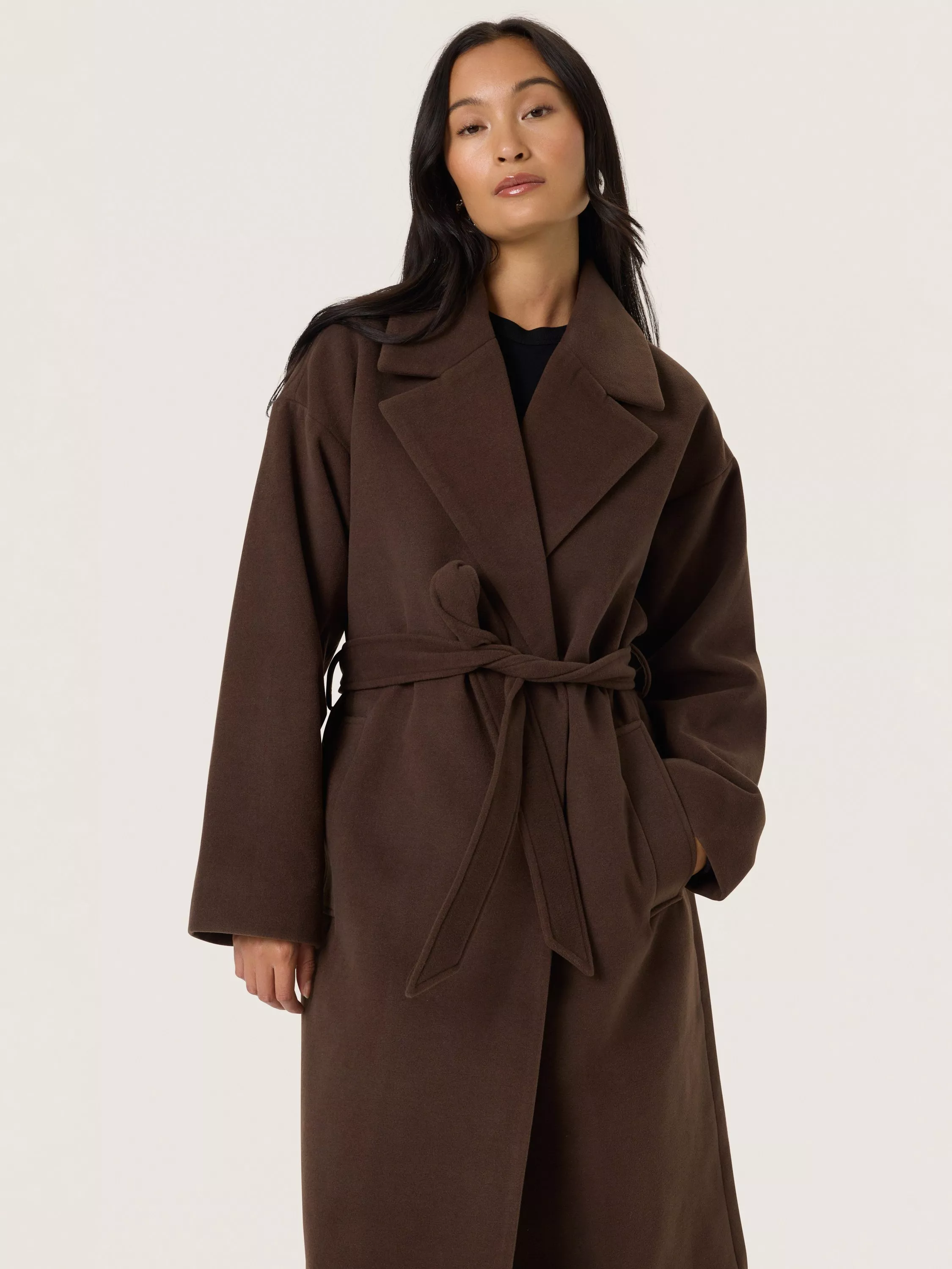 The Rubie coat is a casual and stylish piece of outerwear, that will look great with any outfit. It has a wide notch lapel, and it is fastened with a tying belt at the waist. The coat has a relaxed fit with drop shoulders and wide sleeves, and it has slanted front pockets and comes down to the knees.