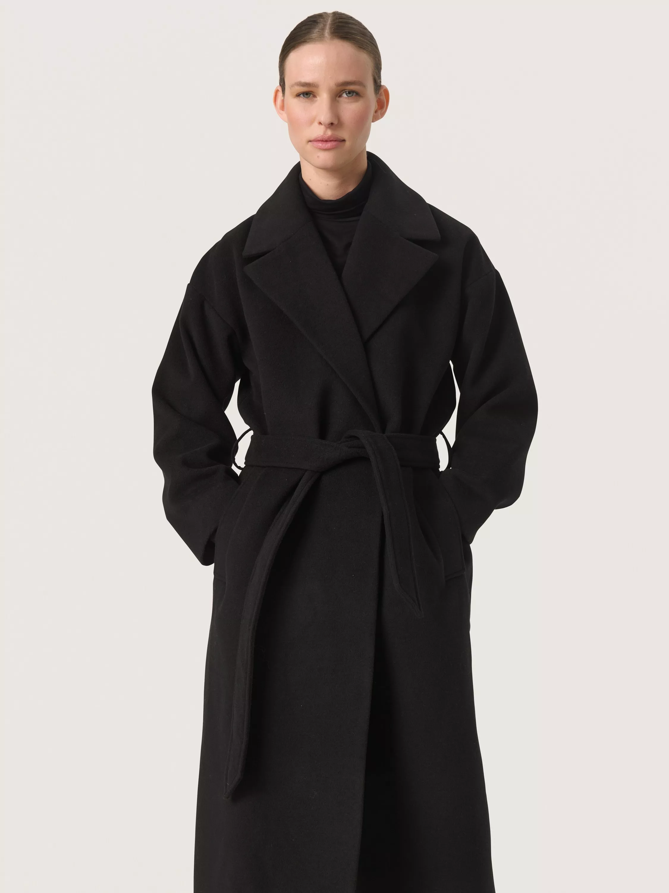 The Rubie coat is a casual and stylish piece of outerwear, that will look great with any outfit. It has a wide notch lapel, and it is fastened with a tying belt at the waist. The coat has a relaxed fit with drop shoulders and wide sleeves, and it has slanted front pockets and comes down to the knees.