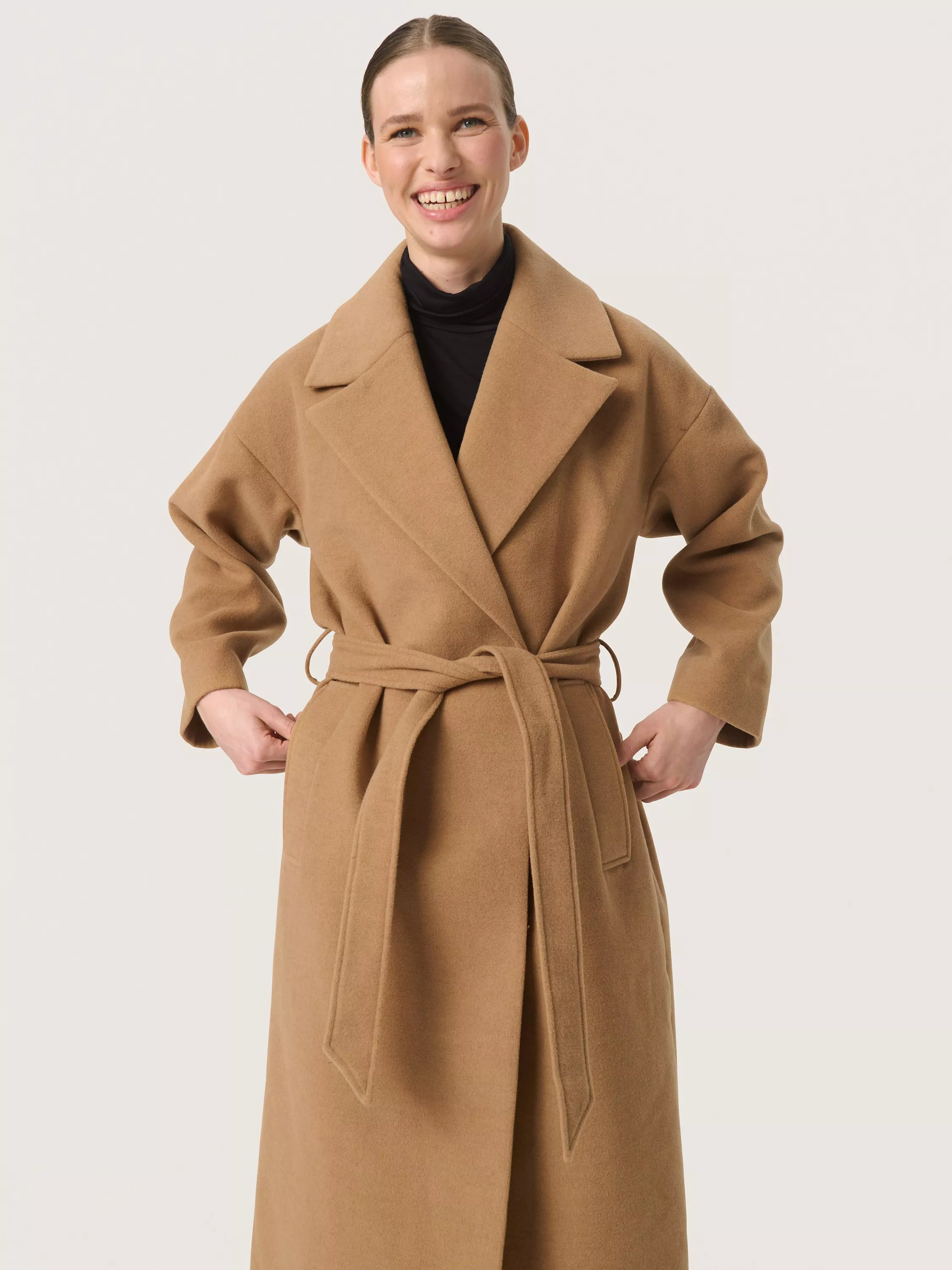 The Rubie coat is a casual and stylish piece of outerwear, that will look great with any outfit. It has a wide notch lapel, and it is fastened with a tying belt at the waist. The coat has a relaxed fit with drop shoulders and wide sleeves, and it has slanted front pockets and comes down to the knees.