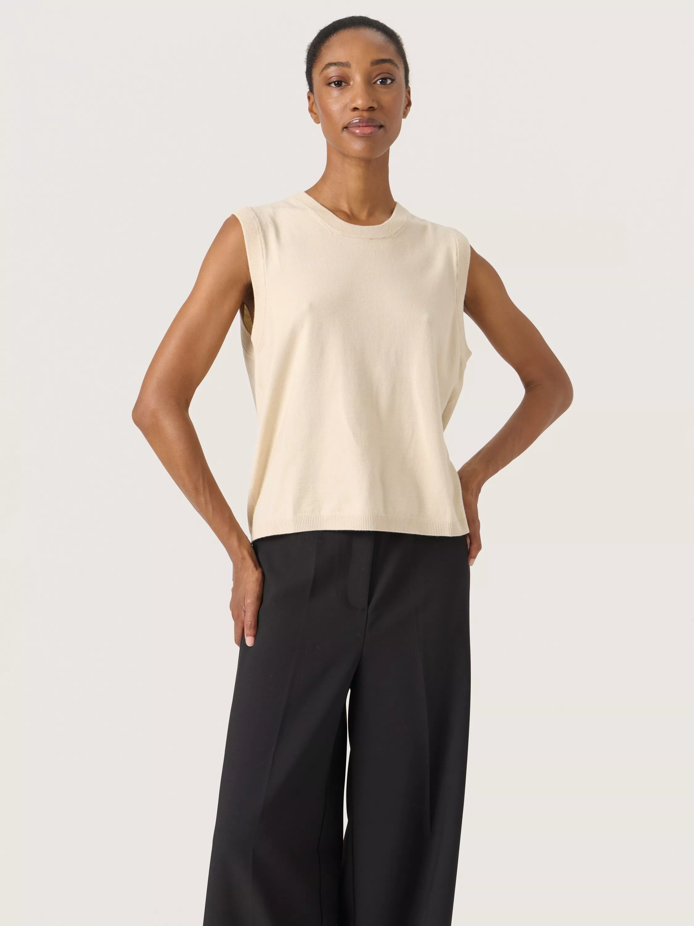 The Sina vest is a soft and casual knit top, and the perfect choice if you need an extra layer for your outfit. It has a round neck and a regular fit, and the vest is cut at the hips. It is sleeveless with deep armholes, and it has wide shoulders.