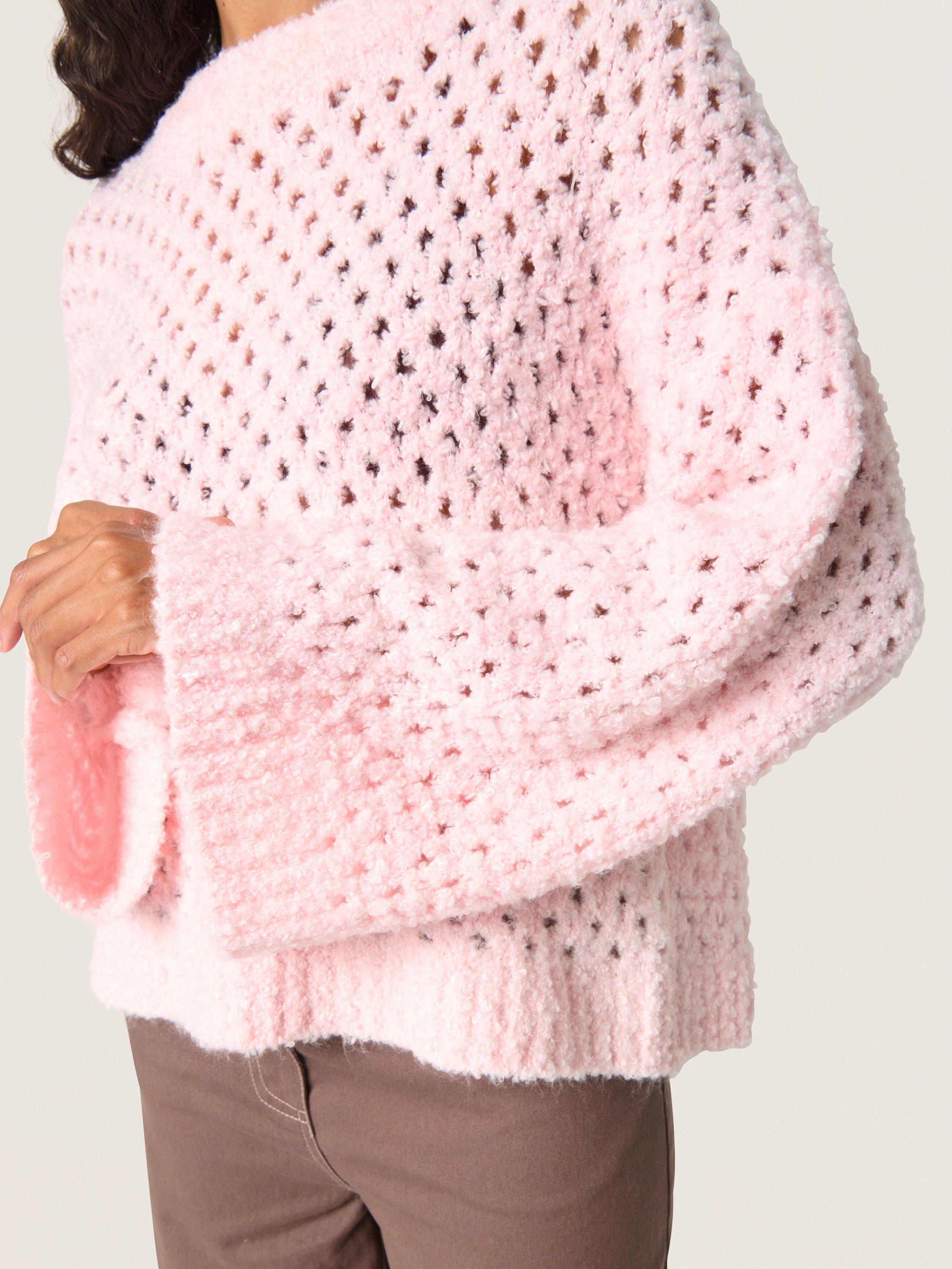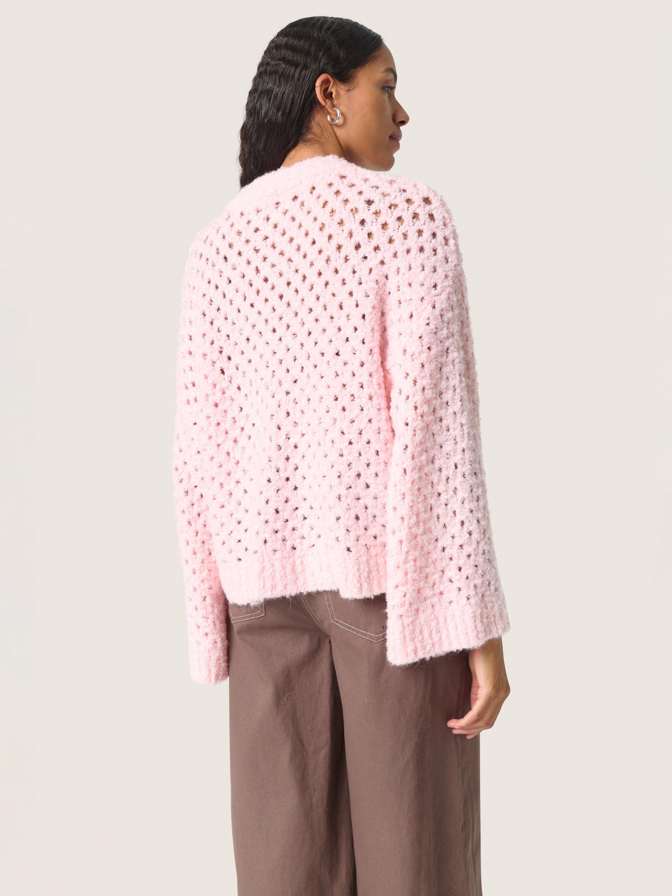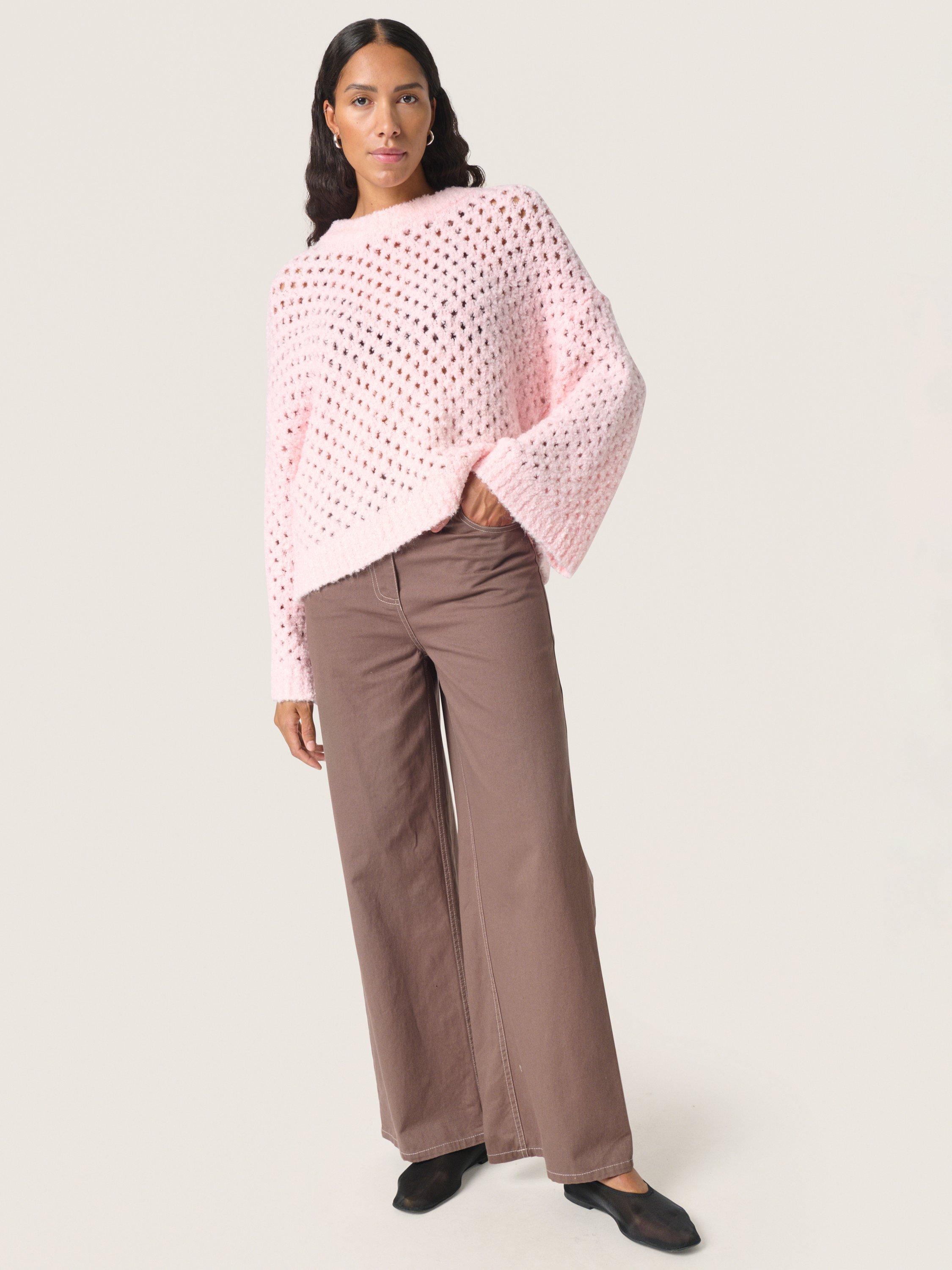 The SLBabbette pullover is a relaxed and cosy style made in a hole knit fabric with rib edges. It has a slash neck and a casual fit with drop shoulders, and it is cut at the hips. The sleeves come down below the wrists, and they have a wide fit.